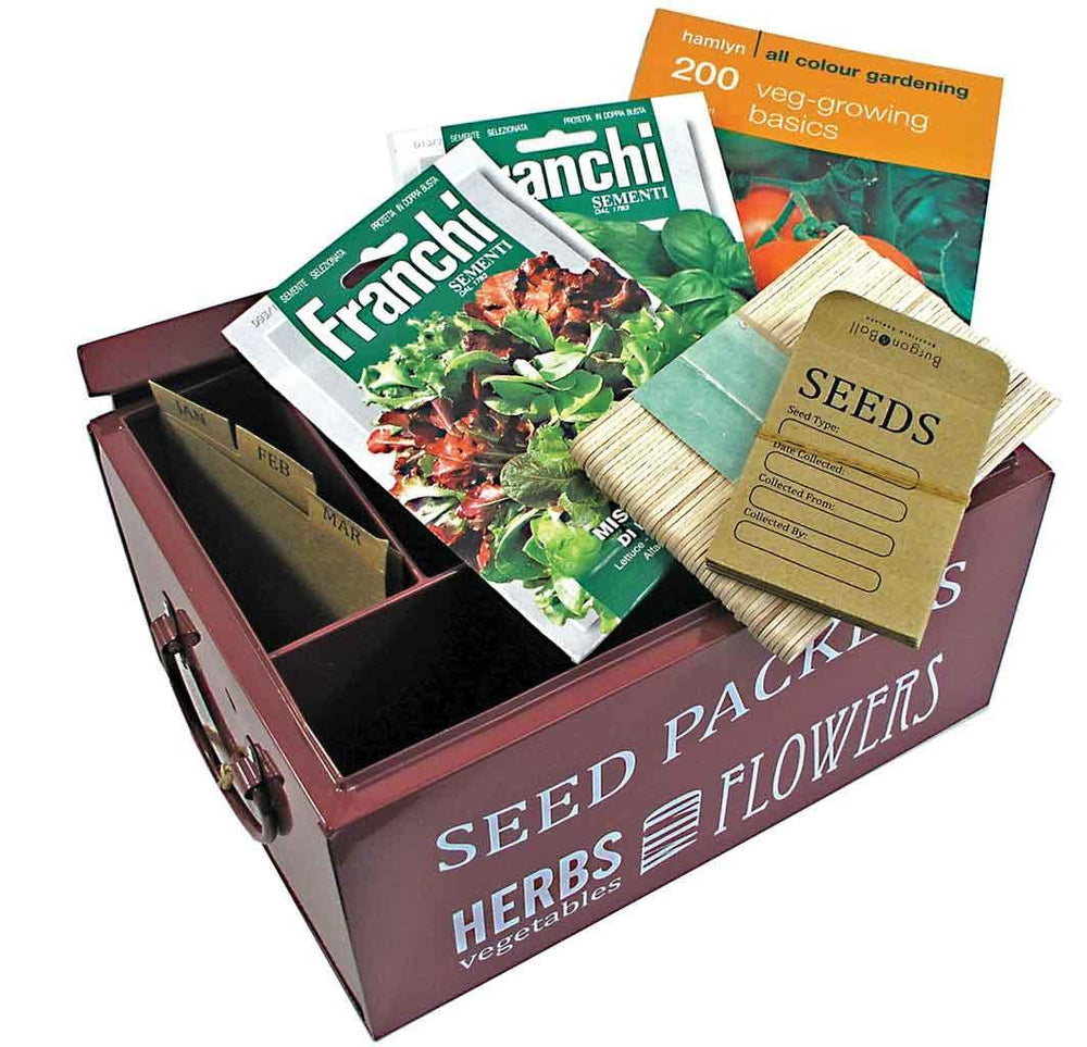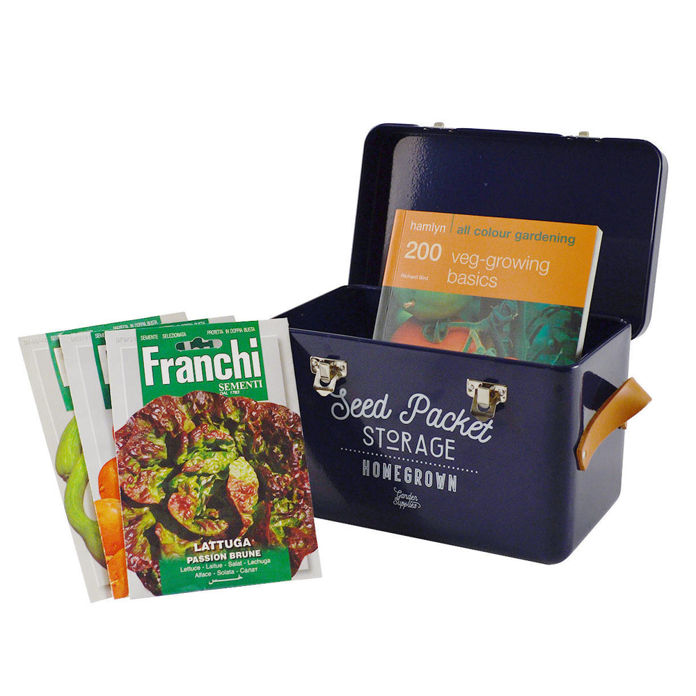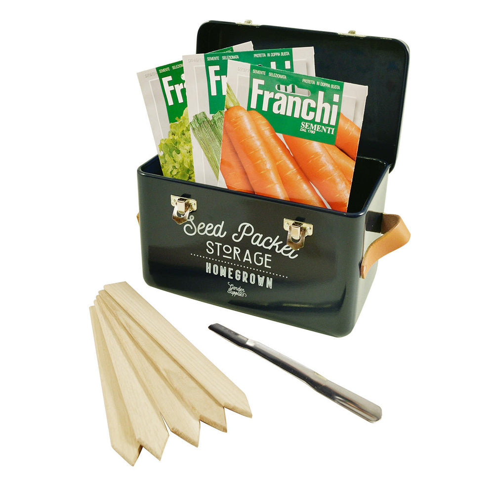 The vintage style seed tin with leather handles, a seedling widger, 5 x oak plant labels and 3 delicious packets of Italian vegetable seeds.