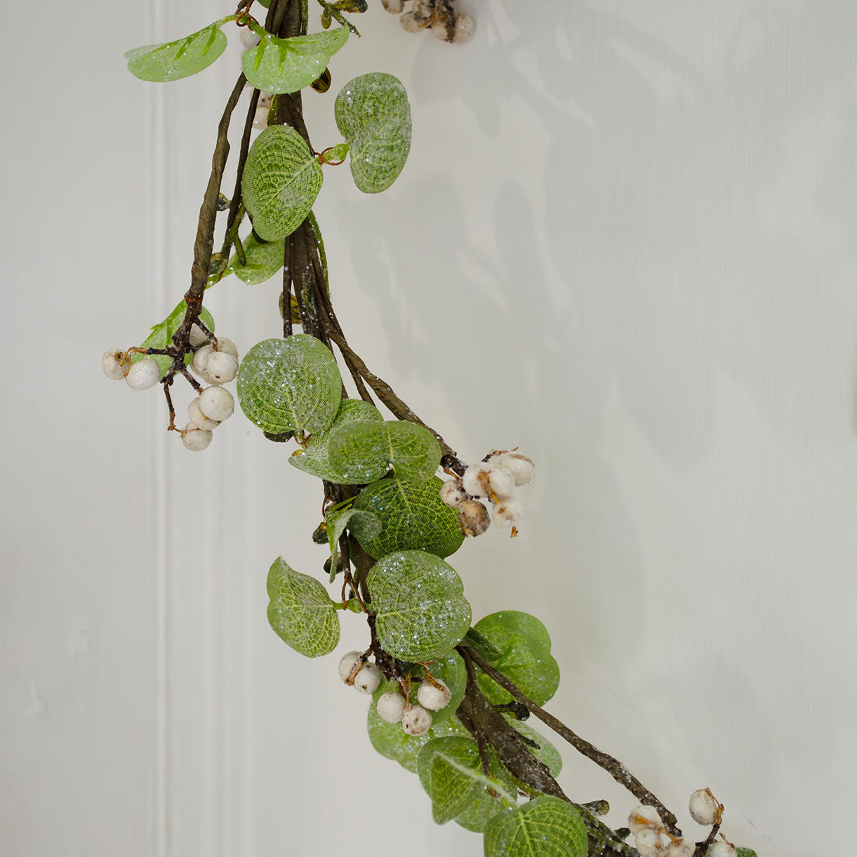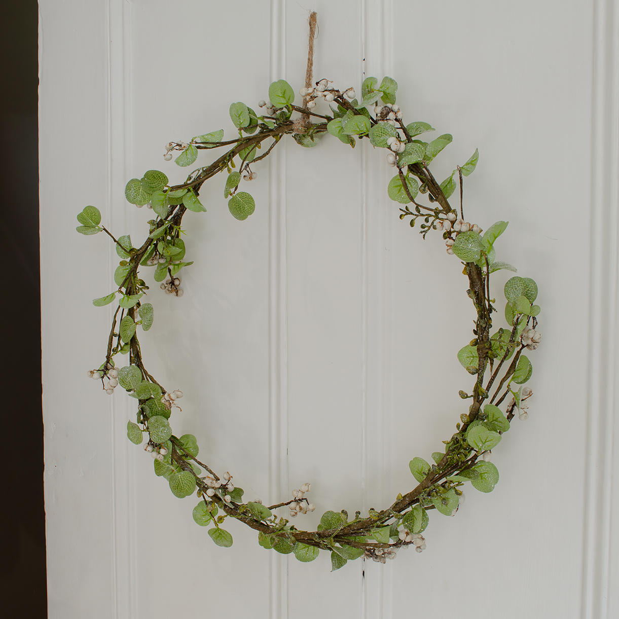 This gorgeous, simple hoop shaped wreath makes for a beautiful wall decoration, faux eucalyptus leaves with delicate detailing from white berries.
