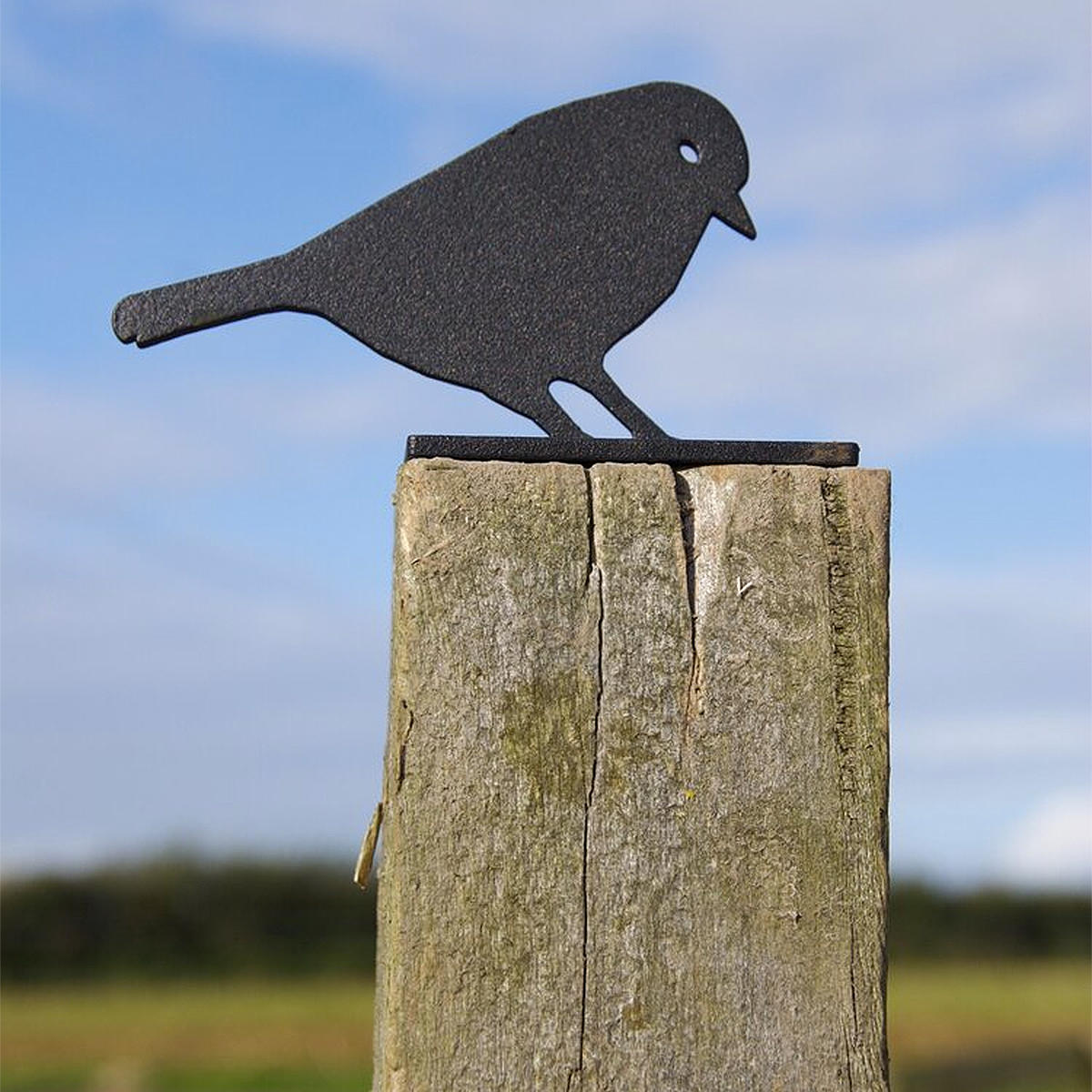 Life-size bird silhouettes cut from 4mm sheet metal, and then powder-coated. These delightful birds are a decorative and easy way to protect fence post tops.