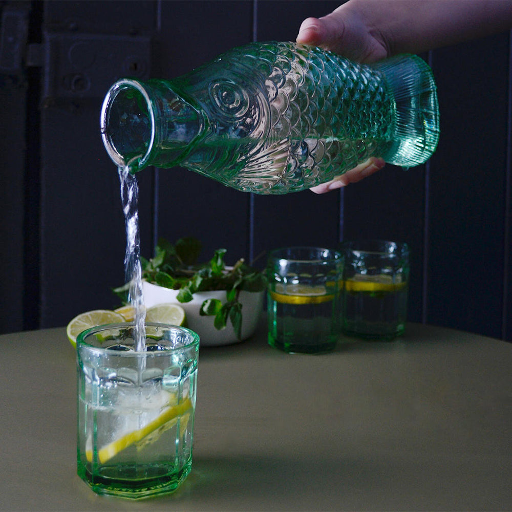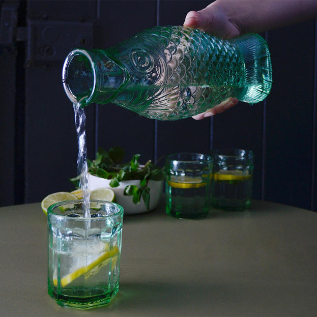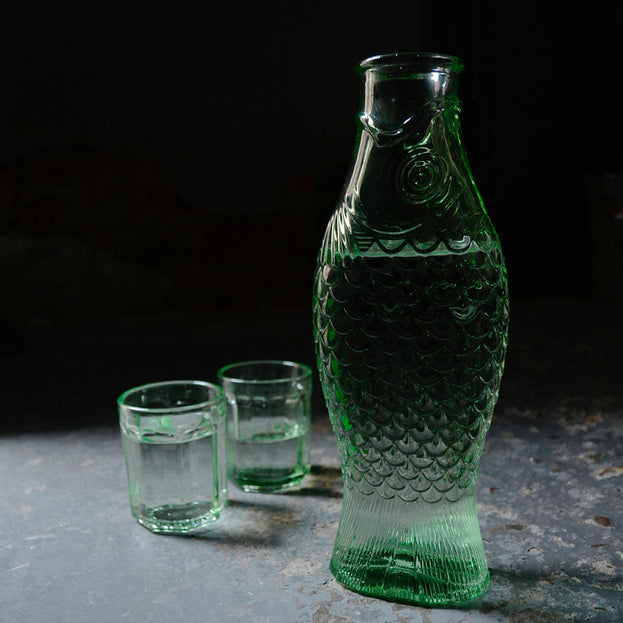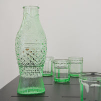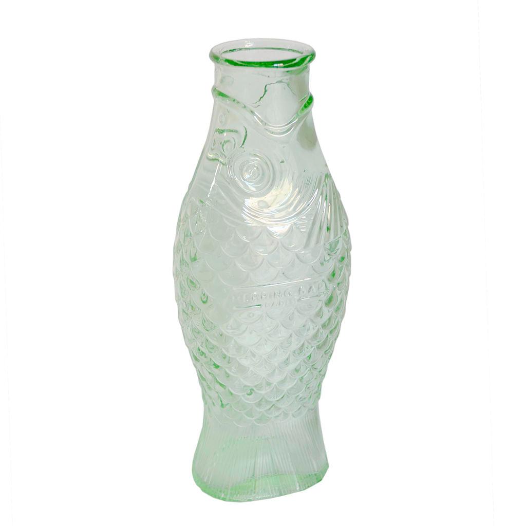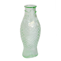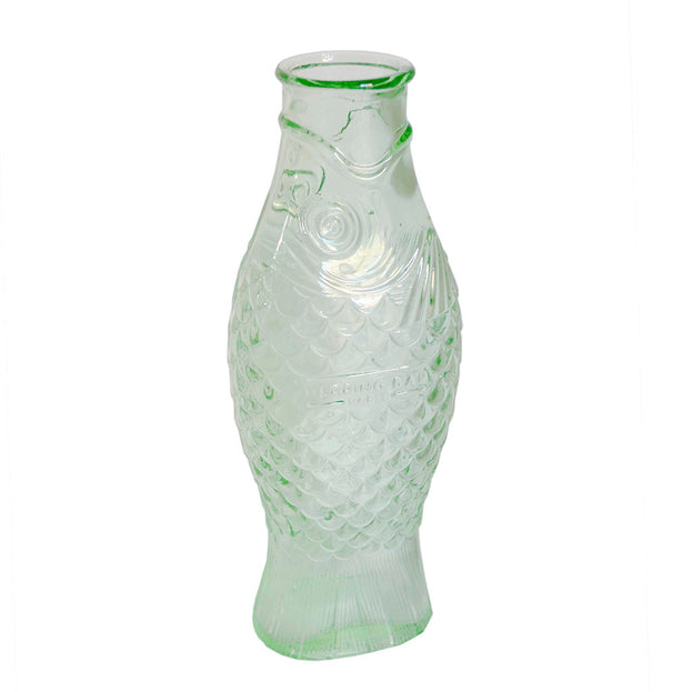 The green glass fish carafe, is perfect as a water carafe, wine carafe or even a funky flower vase.