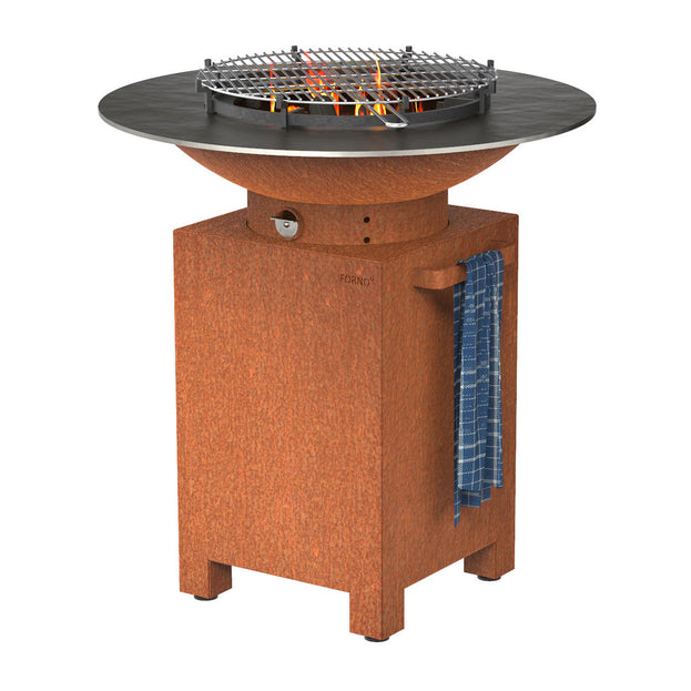 After about 25-30 minutes of burning, the roasting plate of the FORNO® will have reached a temperature of 275 - 300°C on the inner edge. When the fire has been made, you can start by greasing the plate and use a little more oil to cook. The temperature of the outer edge is slightly lower so you can switch between roasting food and keeping food warm. When heating the roasting plate, the plate will slightly dip so excess oil and fats will automatically end up in the fire. When the plate has cooled down, it will completely straighten out again.