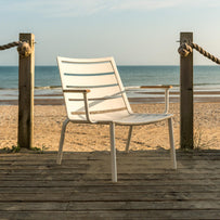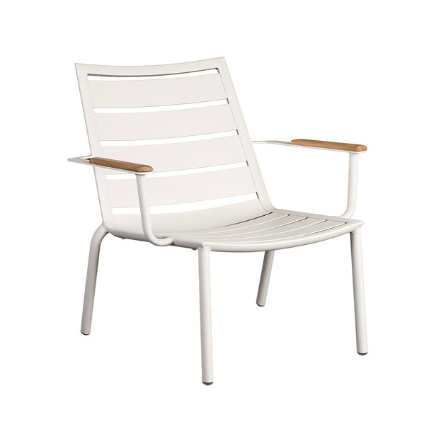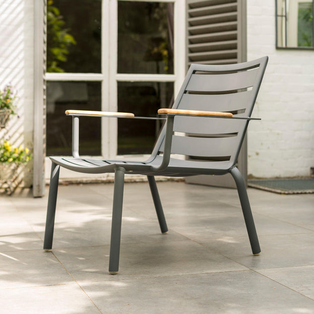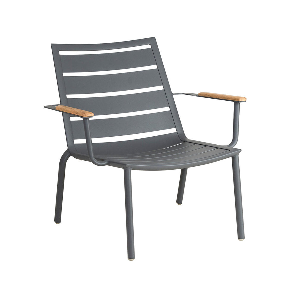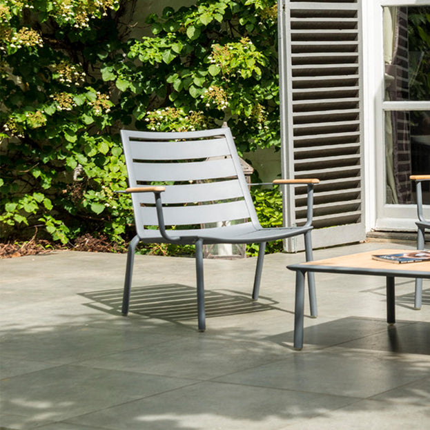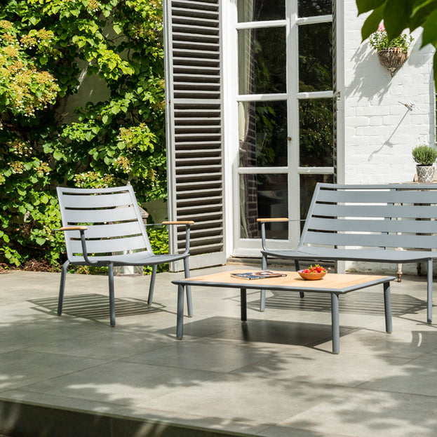 The lounge chairs are a contemporary slatted aluminium, with Roble wood detailing on the armchairs.