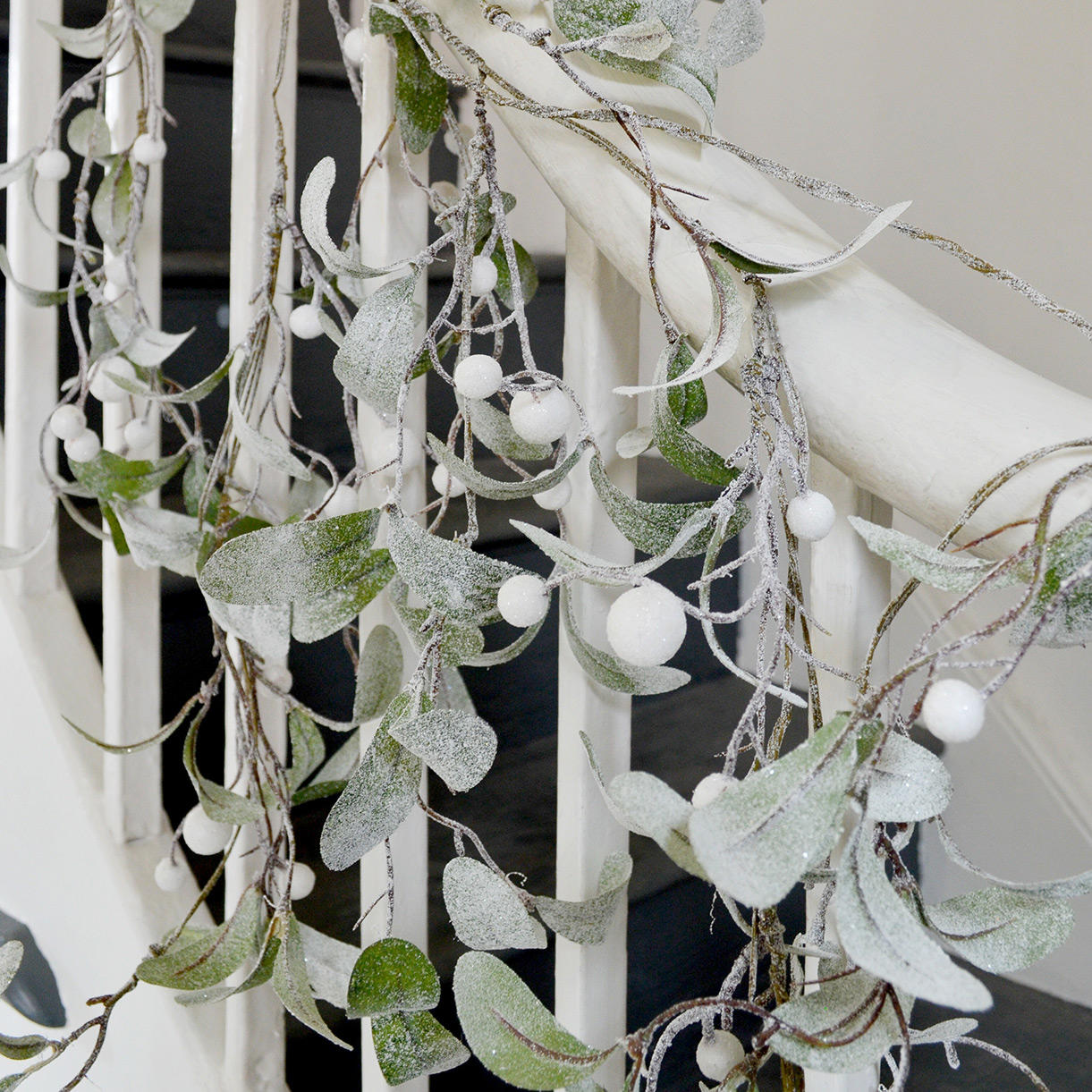 In beautiful soft soft greens and white colour this frosted mistletoe garland makes for a simple classic Christmas floral arrangement around your bannister or hallways.