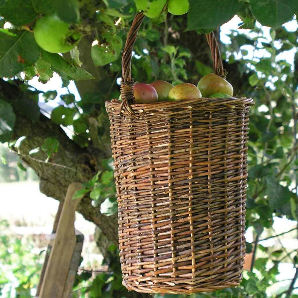 Made of wicker and supplied with a useful whittled twig hook and rope for hanging from sturdy branches. The fruit picking basket is about 50cm long. The basket measurement includes the handle but not the rope and twig. Easily holds 40 medium apples.