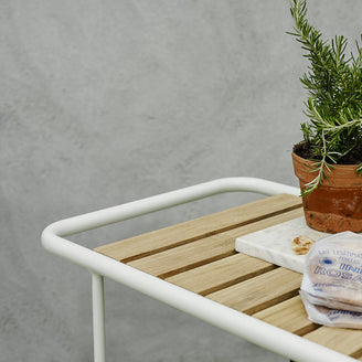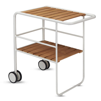 The serving trolley is made from powder-coated aluminium with a slatted teak top and slatted teak shelf.