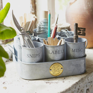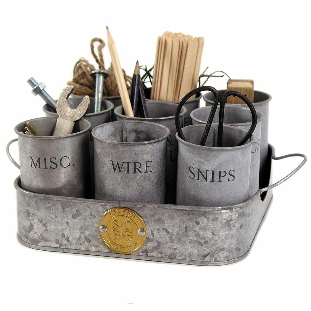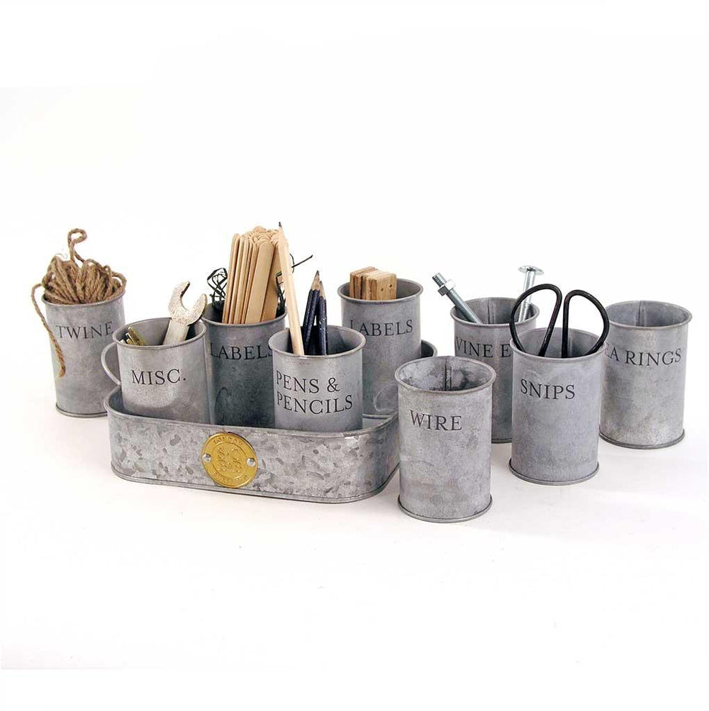 A lovely zinc tray which holds 9 little pots each handily labelled to help bring some order to your garden shed or cupboard.
