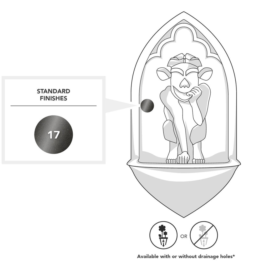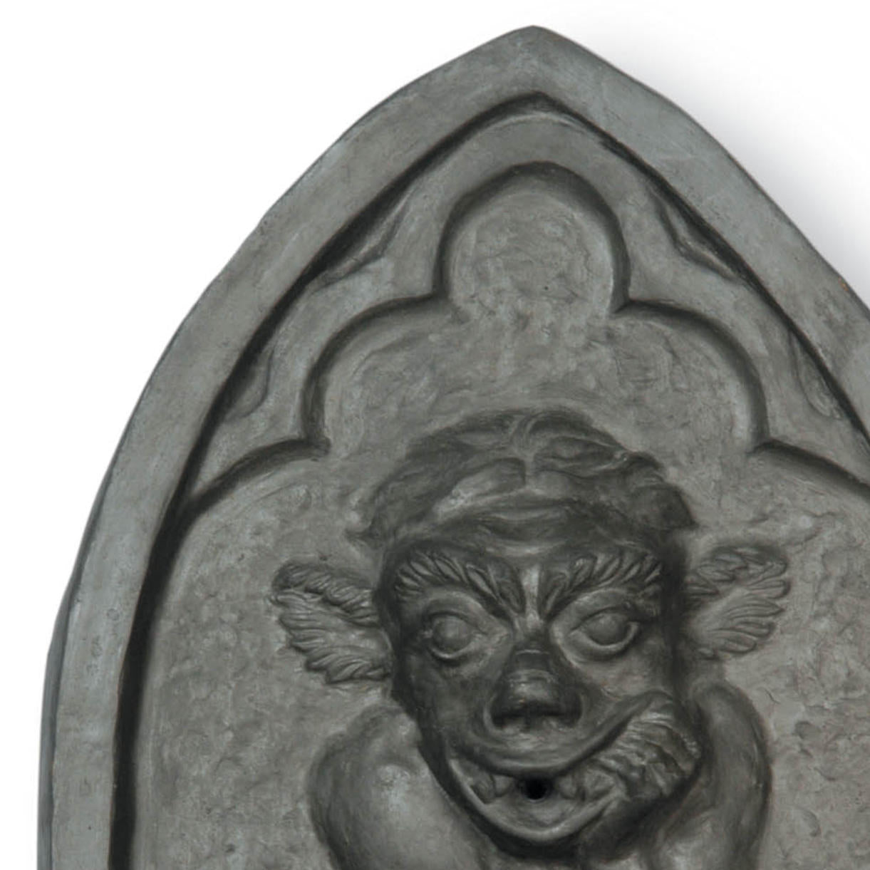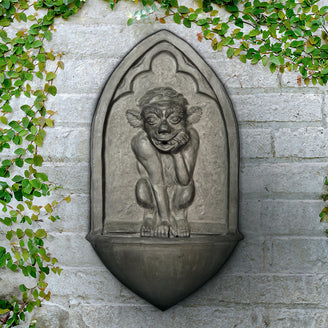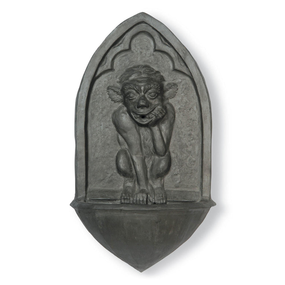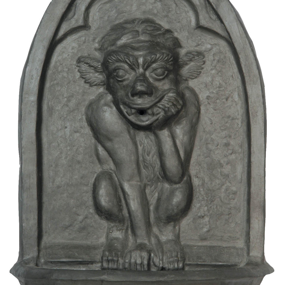 The Gargoyle fountain designed to enhance your outdoor space with a touch of classic styling. Shown here in faux lead finish the lightweight fibreglass water feature is easy to hang on any outside wall, making it a versatile choice for various settings.