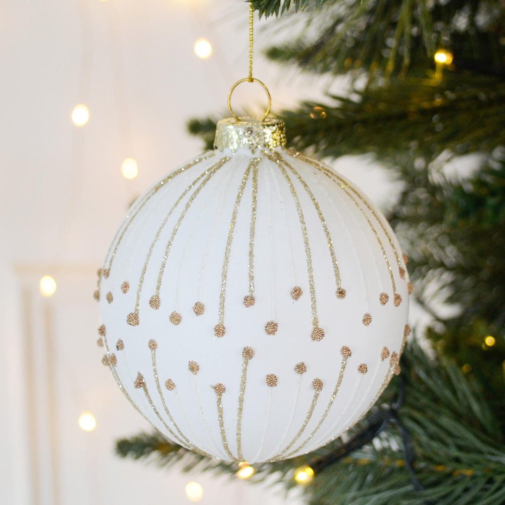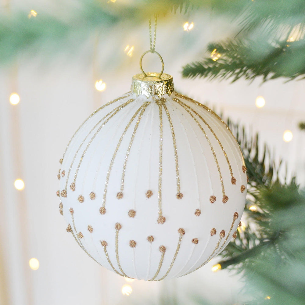 Classic, white Christmas tree bauble with simple glittery, gold pattern detail to catch the light fantastic.
