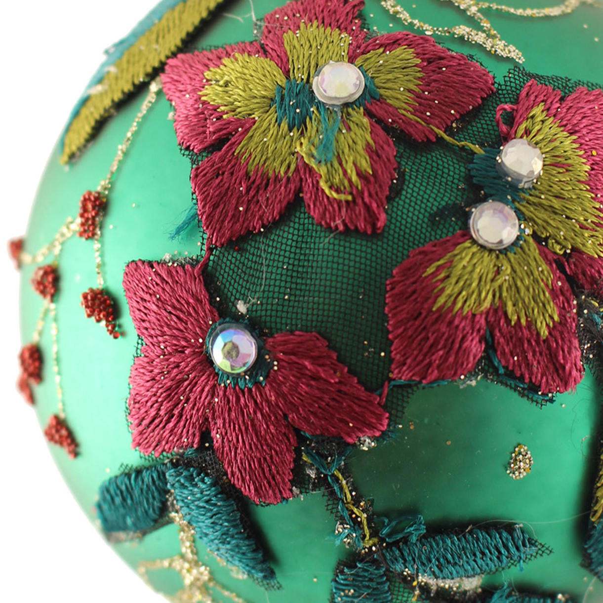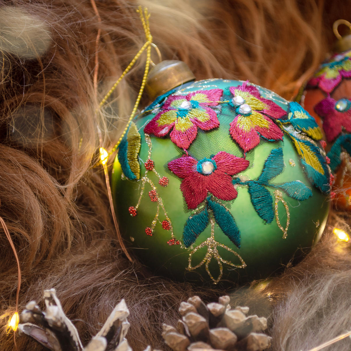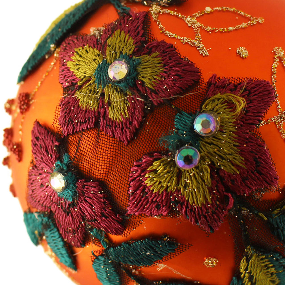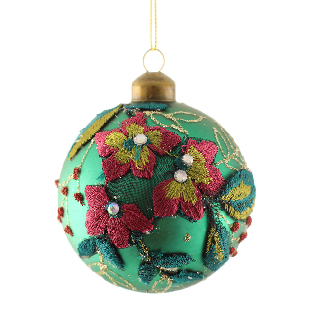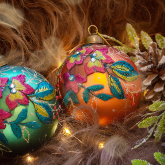 The rich colours and satin embroidery details of these glass baubles are reminiscent of the colours of vintage Mexican colours, and will add a touch of sumptuous glamour to your tree.