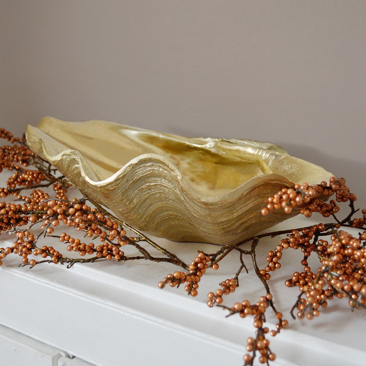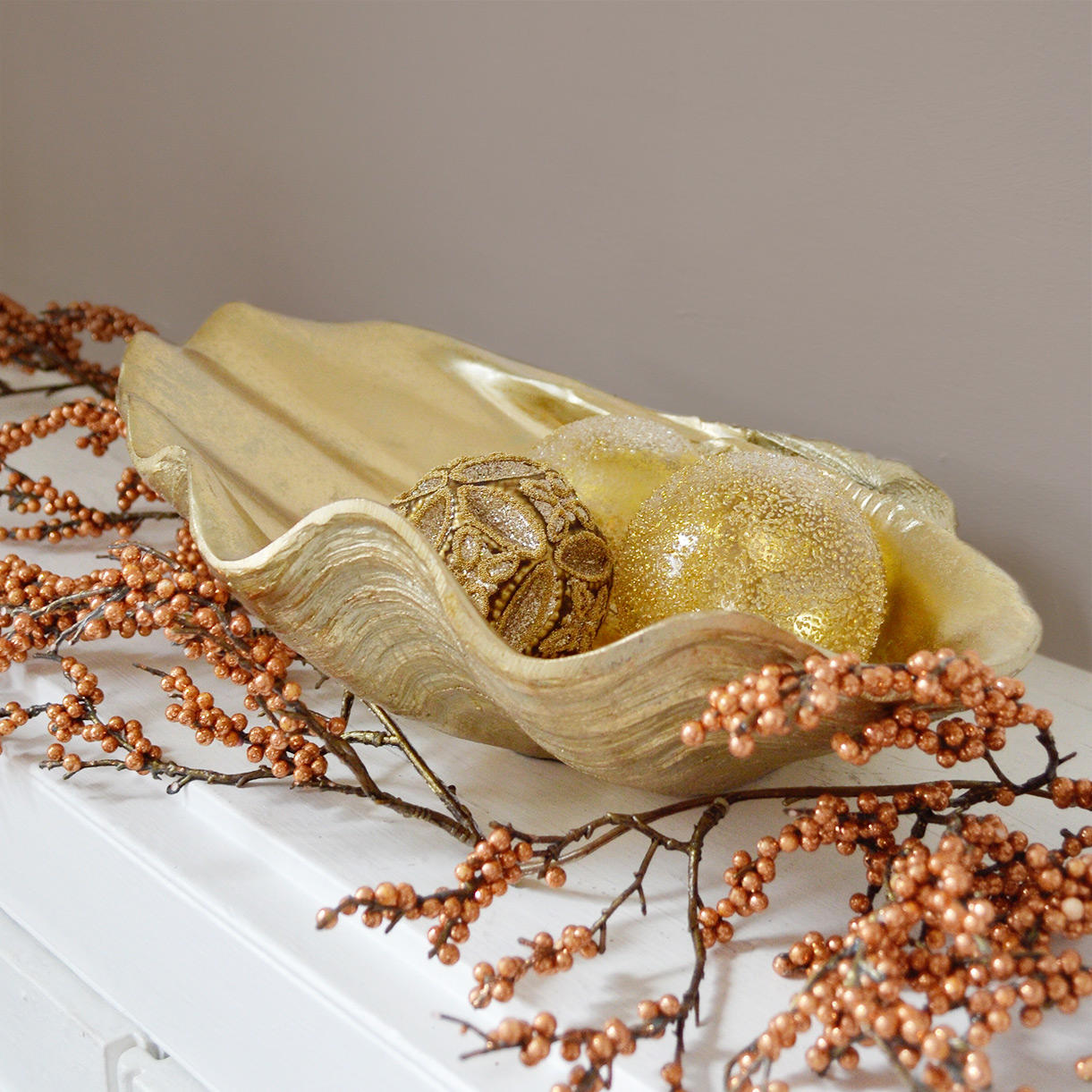 Beautiful gold clam shaped dish cast in resin is prefect for a table centre piece or to hold Christmas baubles and decorations.