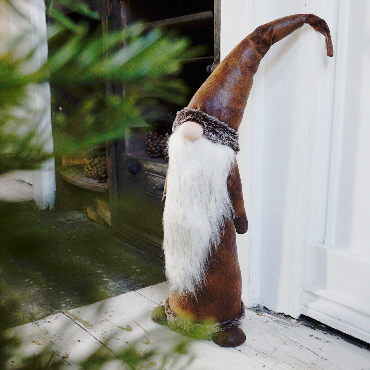 Delightful Nordic style gonk Christmas decoration in soft faux leather is perfect if you want to get away from the red and green of a jingles bells style Christmas.