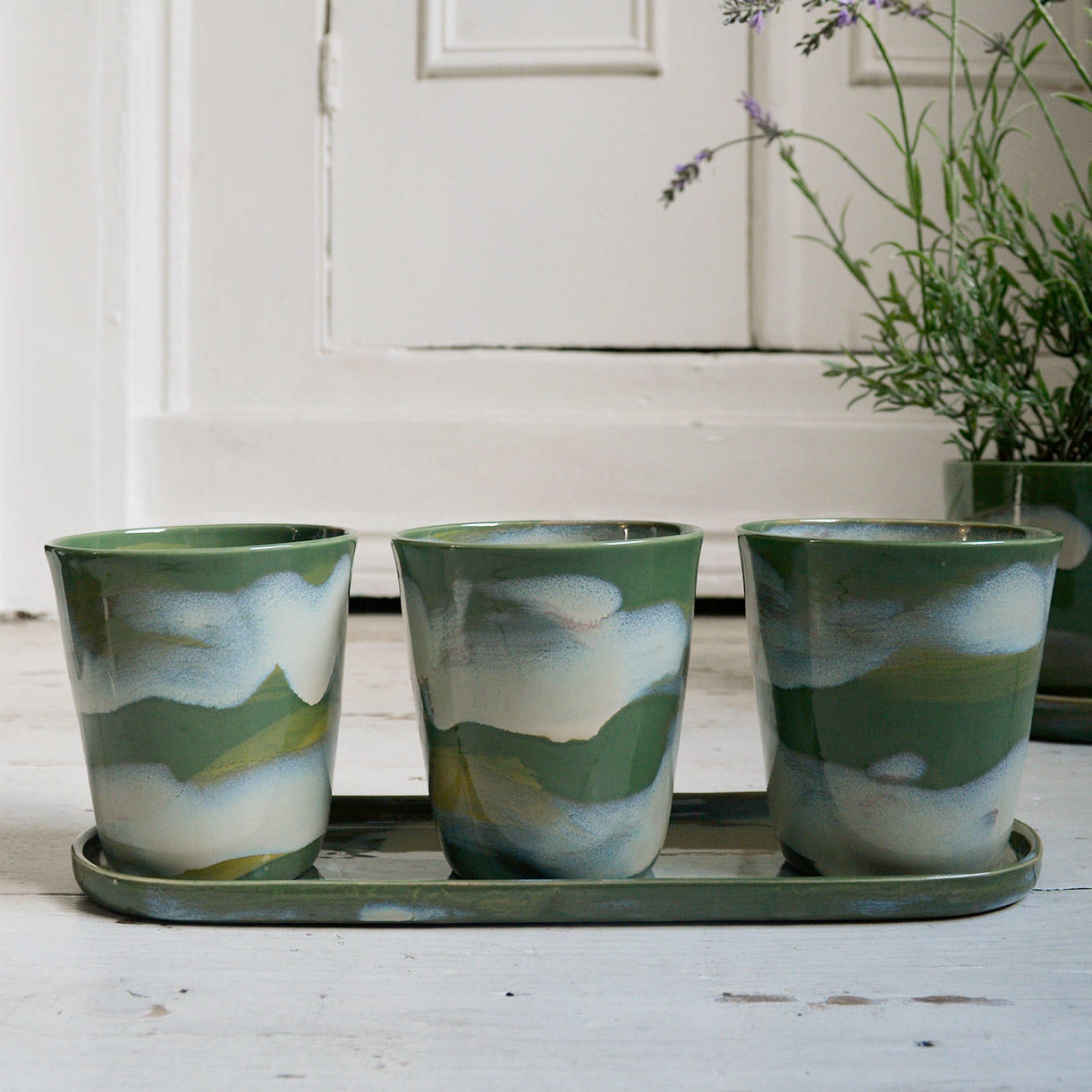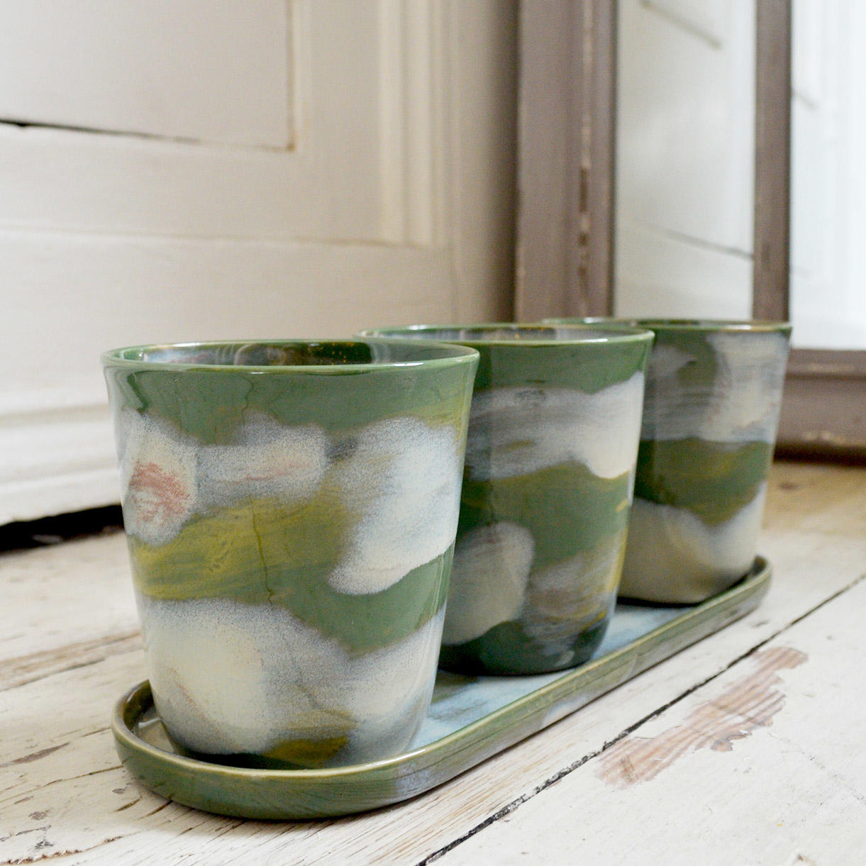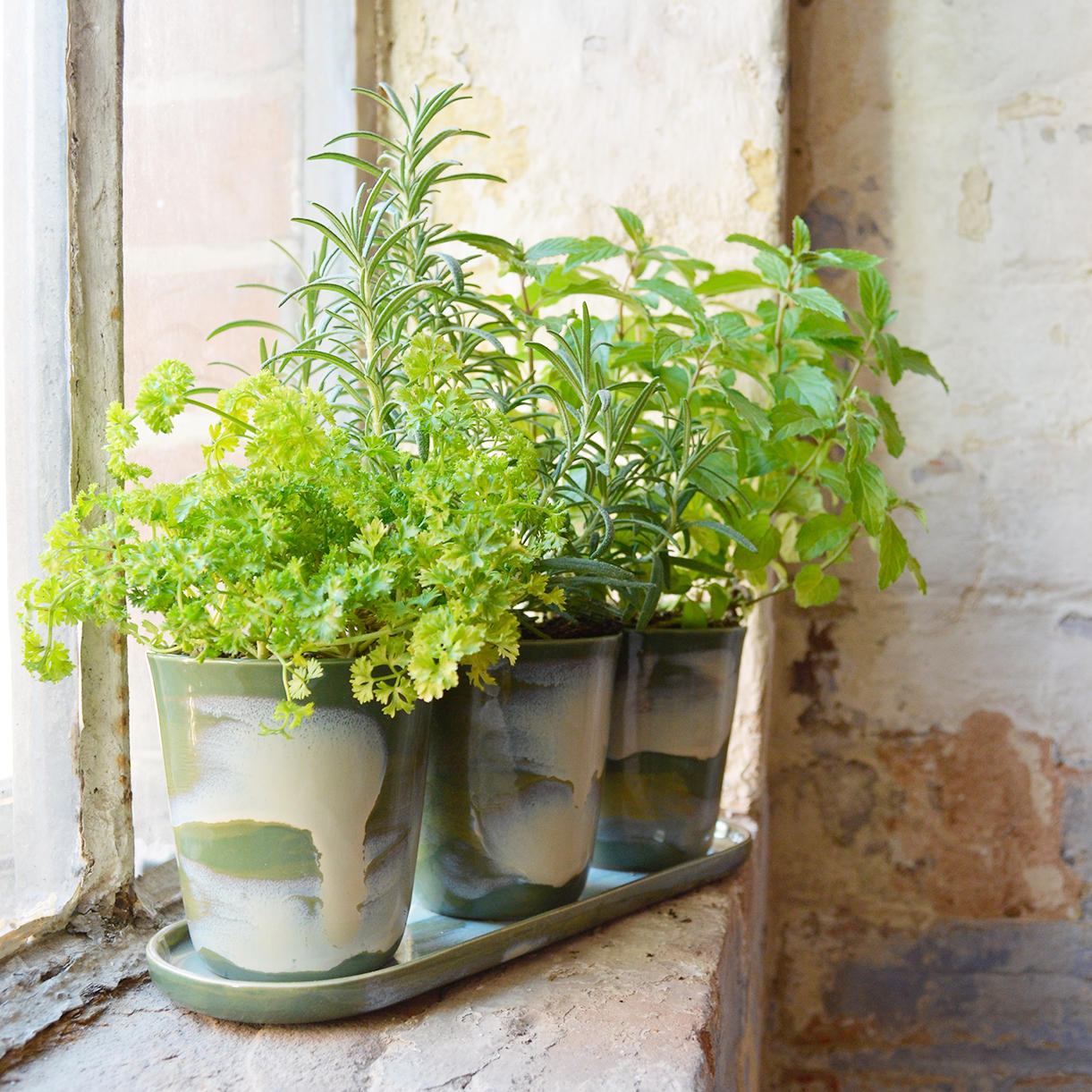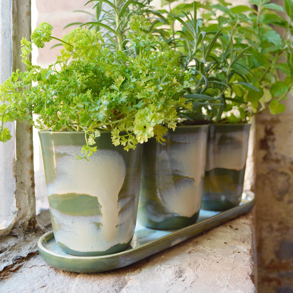 These three green-glazed herb pots on a trough styled saucer definitely fit the William Morris philosophy of being both useful and beautiful.