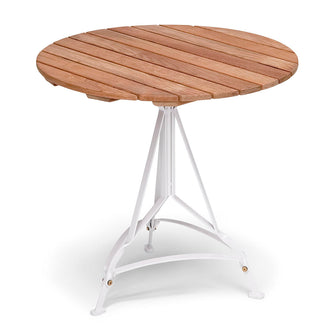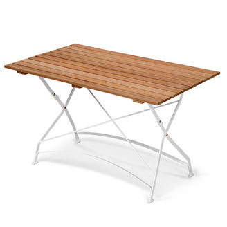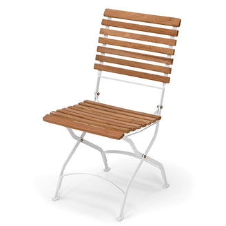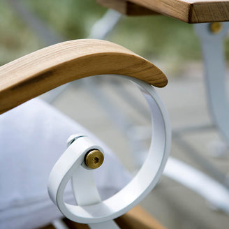 Made from slatted teak wood with a light grey powder-coated steel frame.
