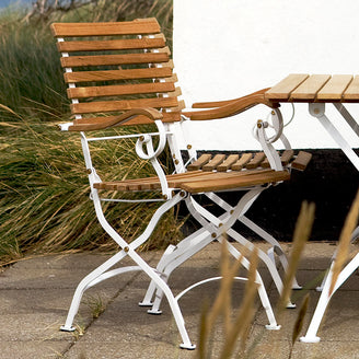 Delightful classical styled garden tables and chairs influenced by benches at the turn of the century in the north of Denmark.