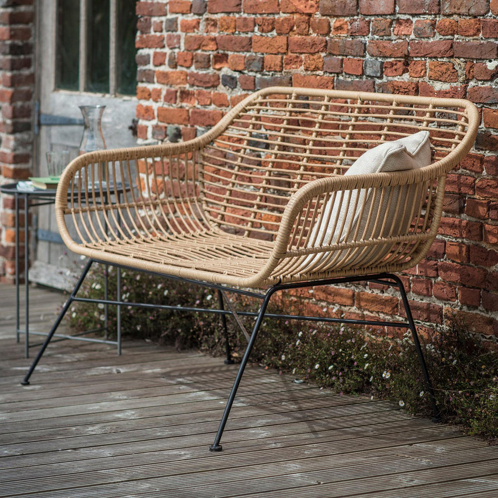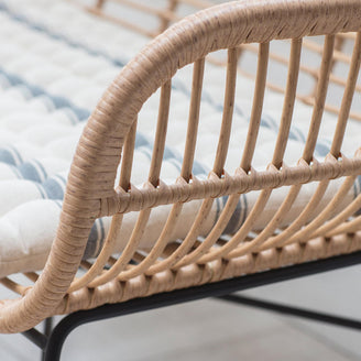 The bench has an intricately hand wrapped all-weather bamboo over a steel frame, which gives a delightful lightweight appearance.