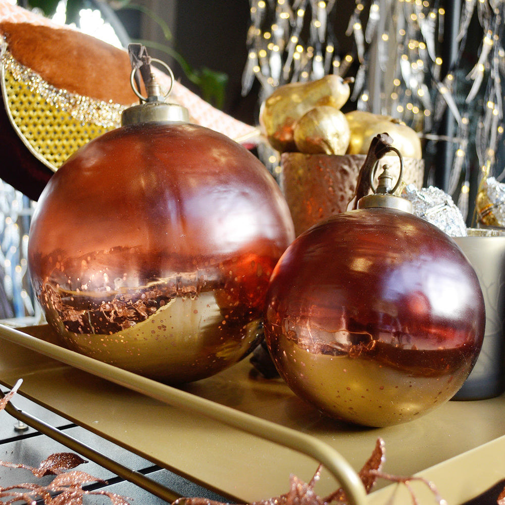In delicious blood orange and gold tones, these giant baubles are stunning in both size but exquisite colours. In deep blood orange russet tones, tipped with antiqued gold, try them in a large bowl as relaxed Christmas decoration presentation. Or hanging by a window catching the sunbeams...