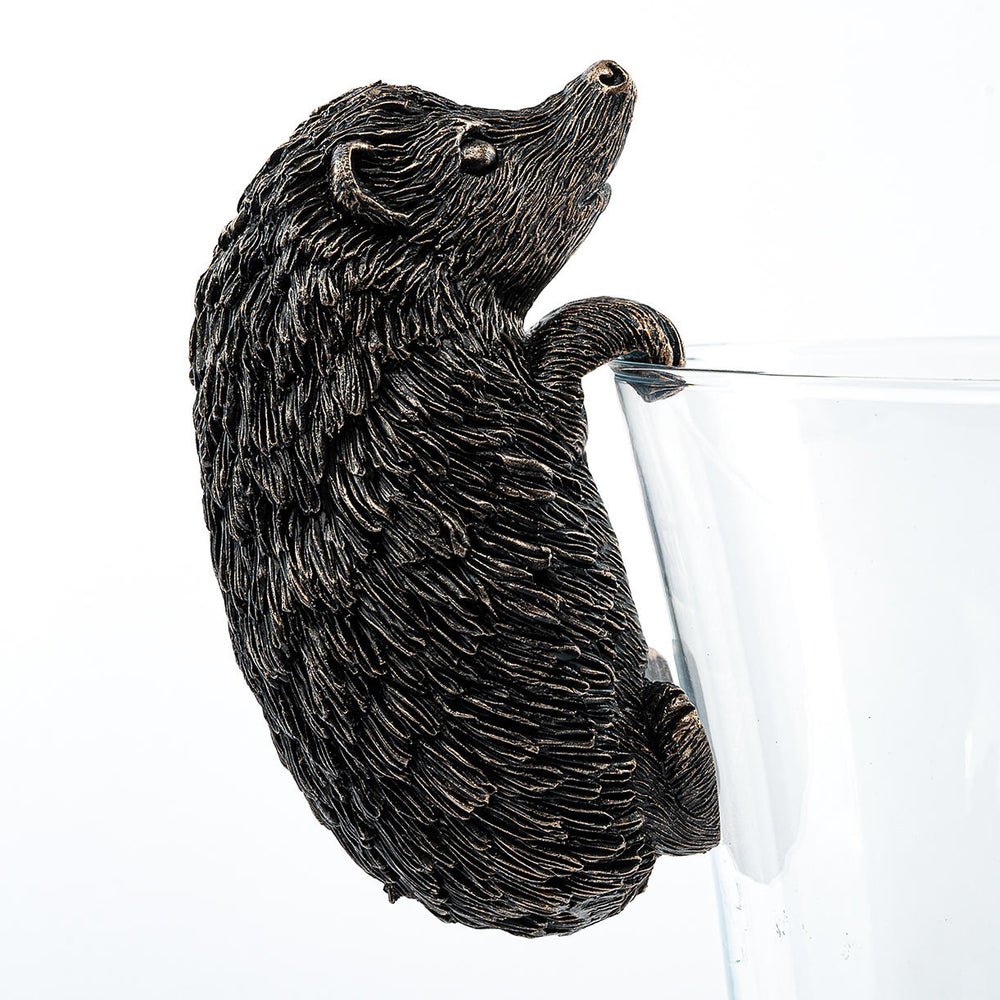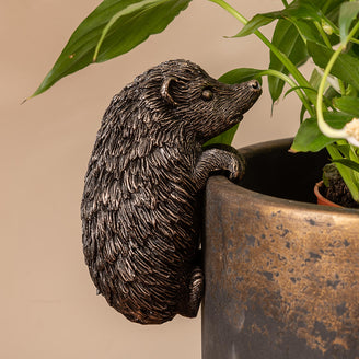Made from resin and with a soft bronze finish, this hedgehog delicately climbs his way up the plant pot.