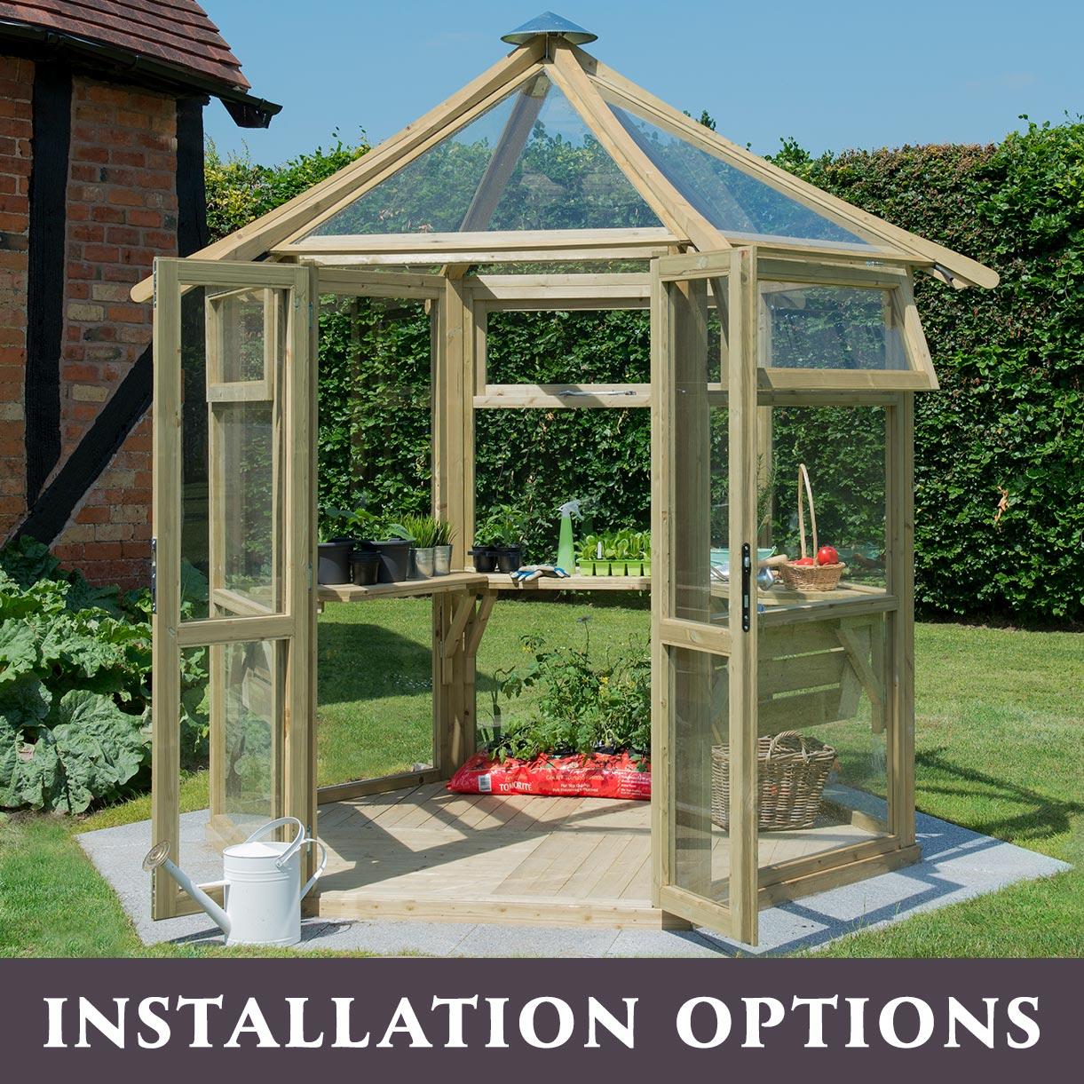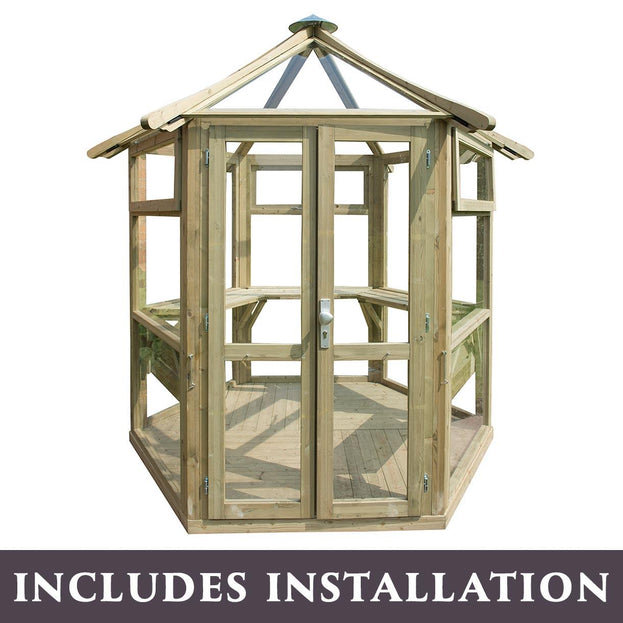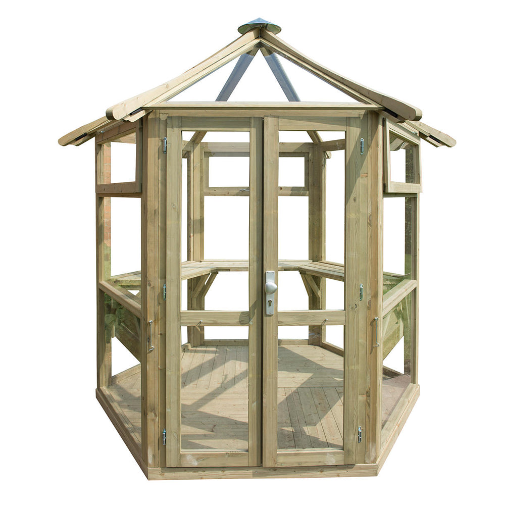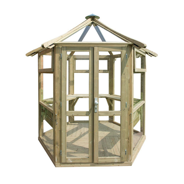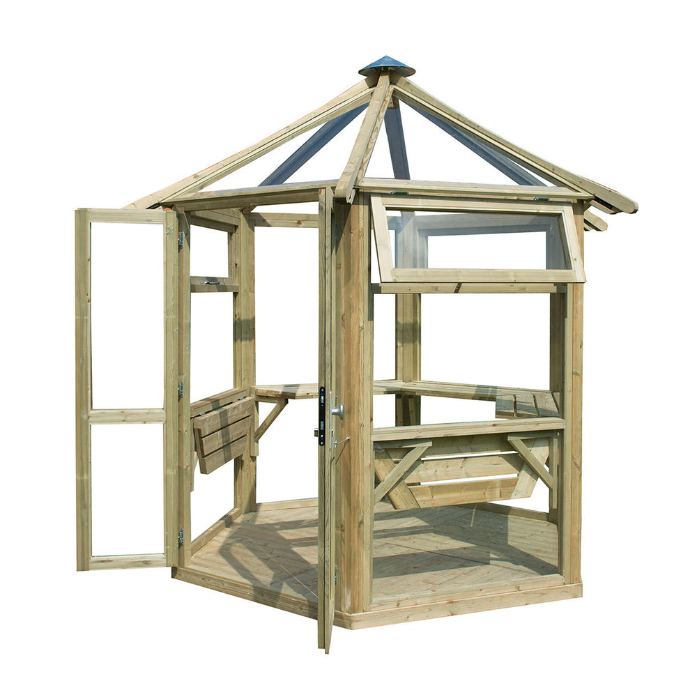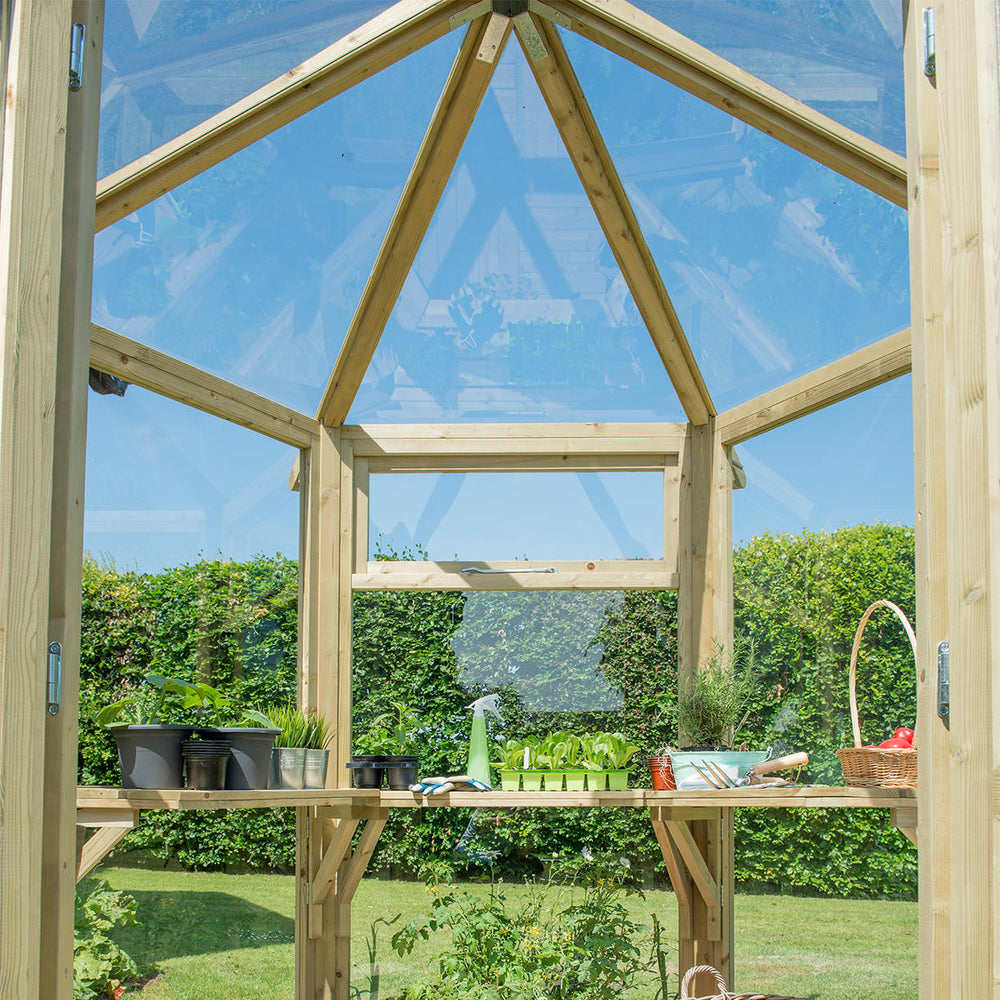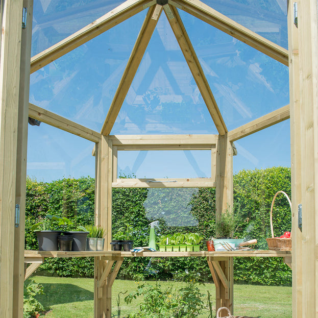 This elegant hexagonal timber greenhouse combines style with functionality, it features fully glazed panels with three opening top windows.