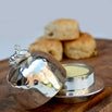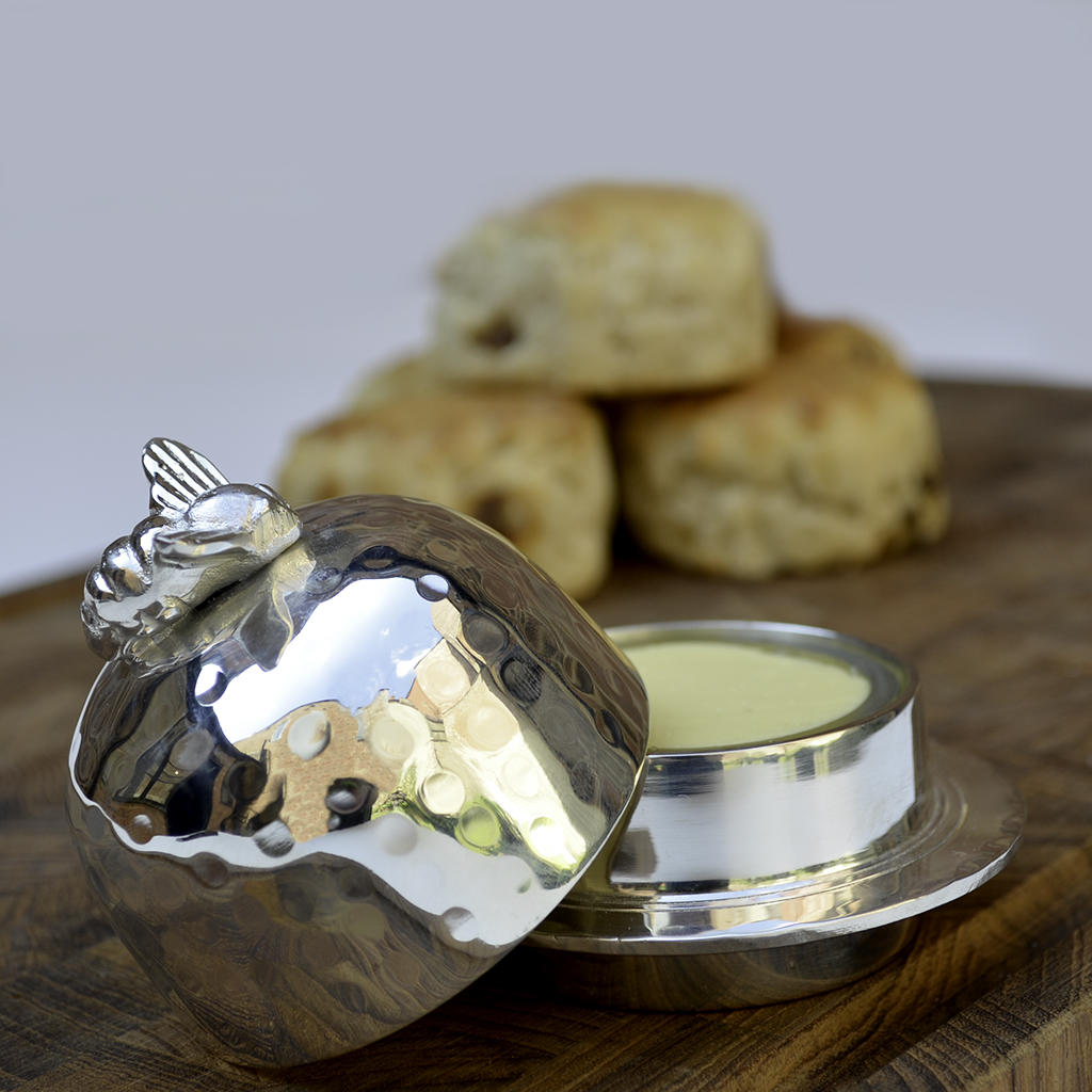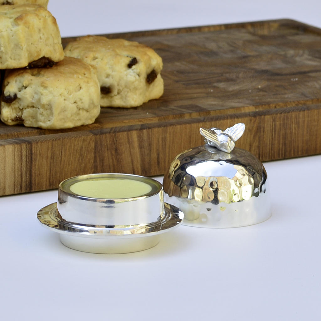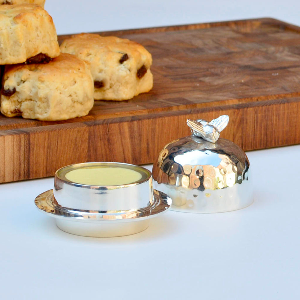 Treat yourself or someone special to this lovely silver plated Honey Bee butter dish. The butter dish has a domed lid with a delicate honey bee gently resting on the edge of the bowl. The dish has a small glass bowl inside that can be removed allowing for easy filling of butter.