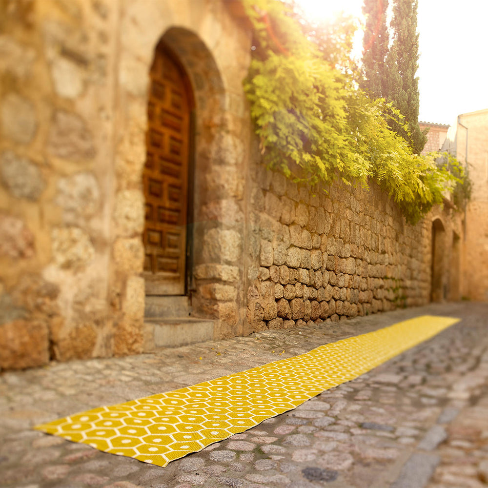 An easy way to extend your outdoor space with these cheery style large outdoor runners. The Honey runners are hard wearing, mildew and UV resistant. They are ideal in wet damp places such as leaky conservatories or outdoor patios and balconies. Use to cover a multitude of sins!