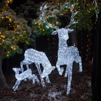 Create a stunning display with this magnificent outdoor deer family. The stag is a magnificent creature sounding proud, guarding his offspring and partner from external threats