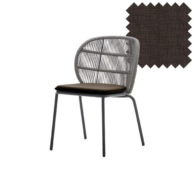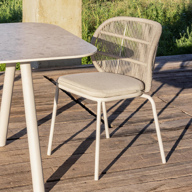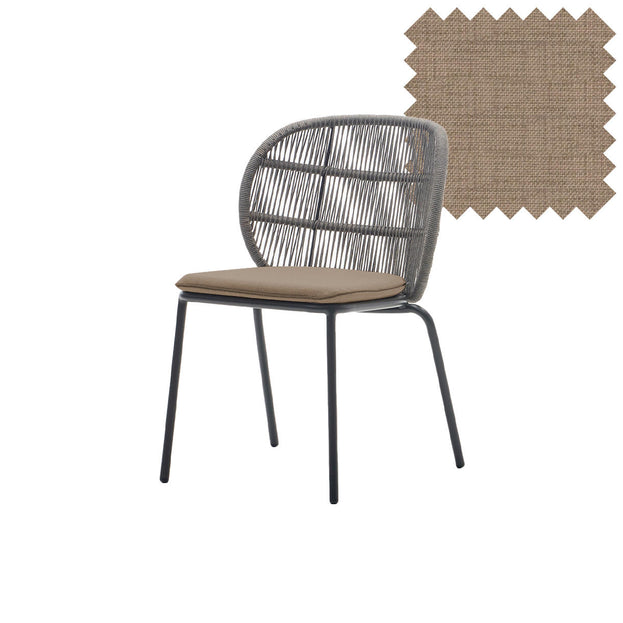 An elegant outdoor dining chair in fossil grey with a rounded back and elegant curves.