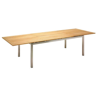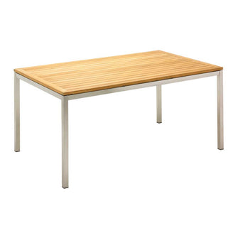 Kore tables have brushed electroplated stainless steel legs with a slatted teak top.