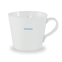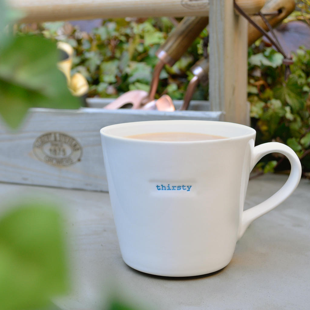With retro styling, each mug is hand-stamped in the traditional typewriter font with that special word - Thirsty!