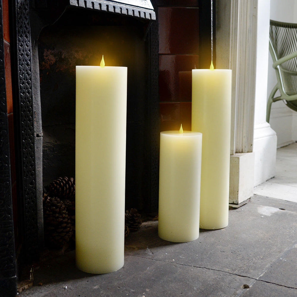 In an ivory waxed finish these over-sized battery-operated candles are a statement piece in their own right.