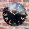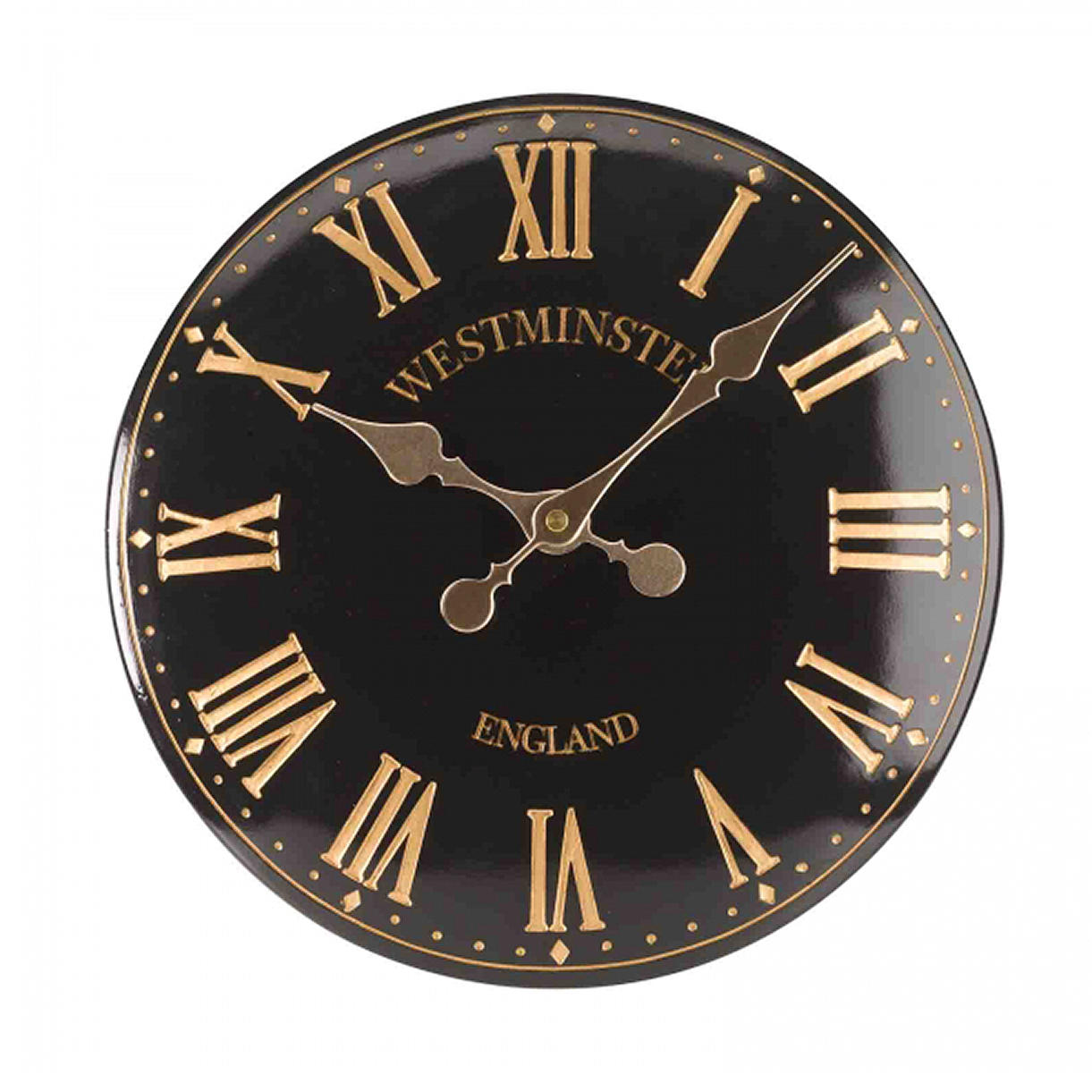 Classic outdoor clock, with gloss black finish, gold hands and Roman numerals.