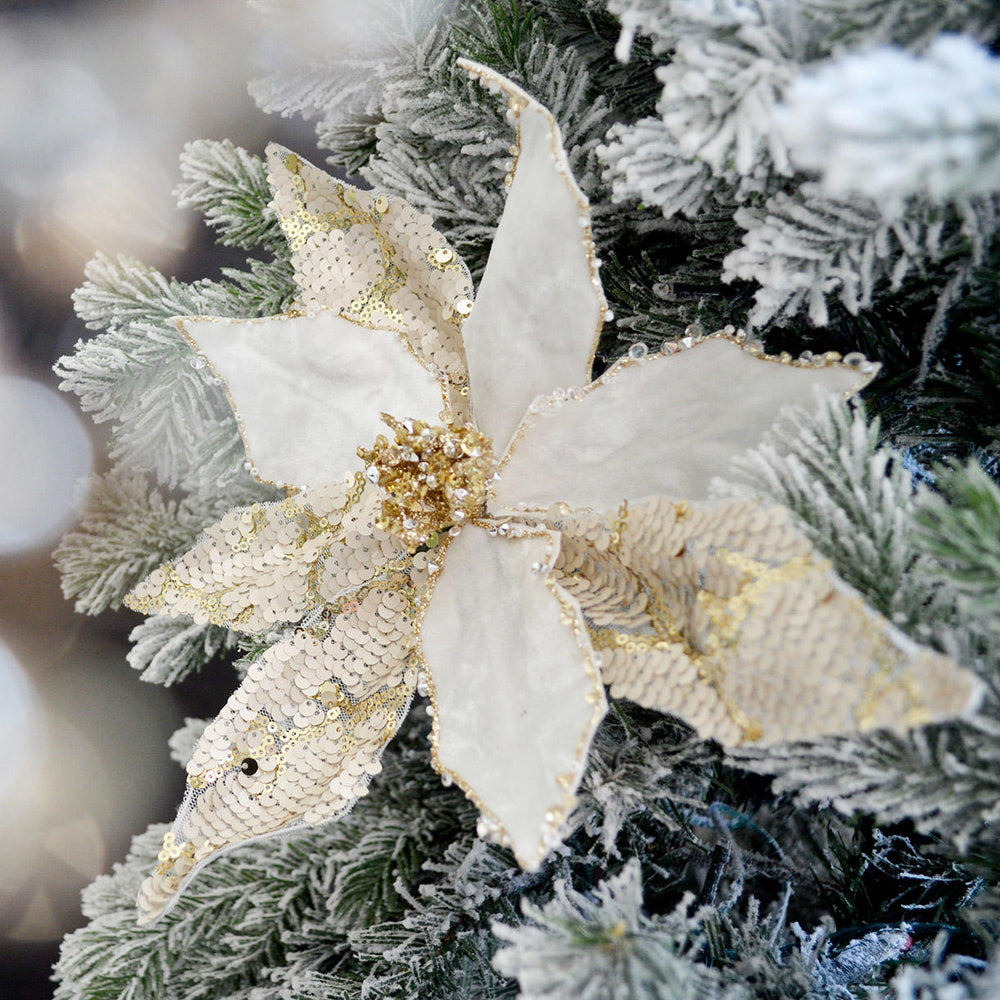 These large, sequinned poinsettia clip decorations will truly make a statement on your Christmas tree.