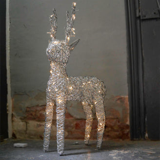 Made from synthetic outdoor all weather white rattan and covered in silver sparkle, the reindeer is covered in 120 warm white LED lights.