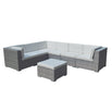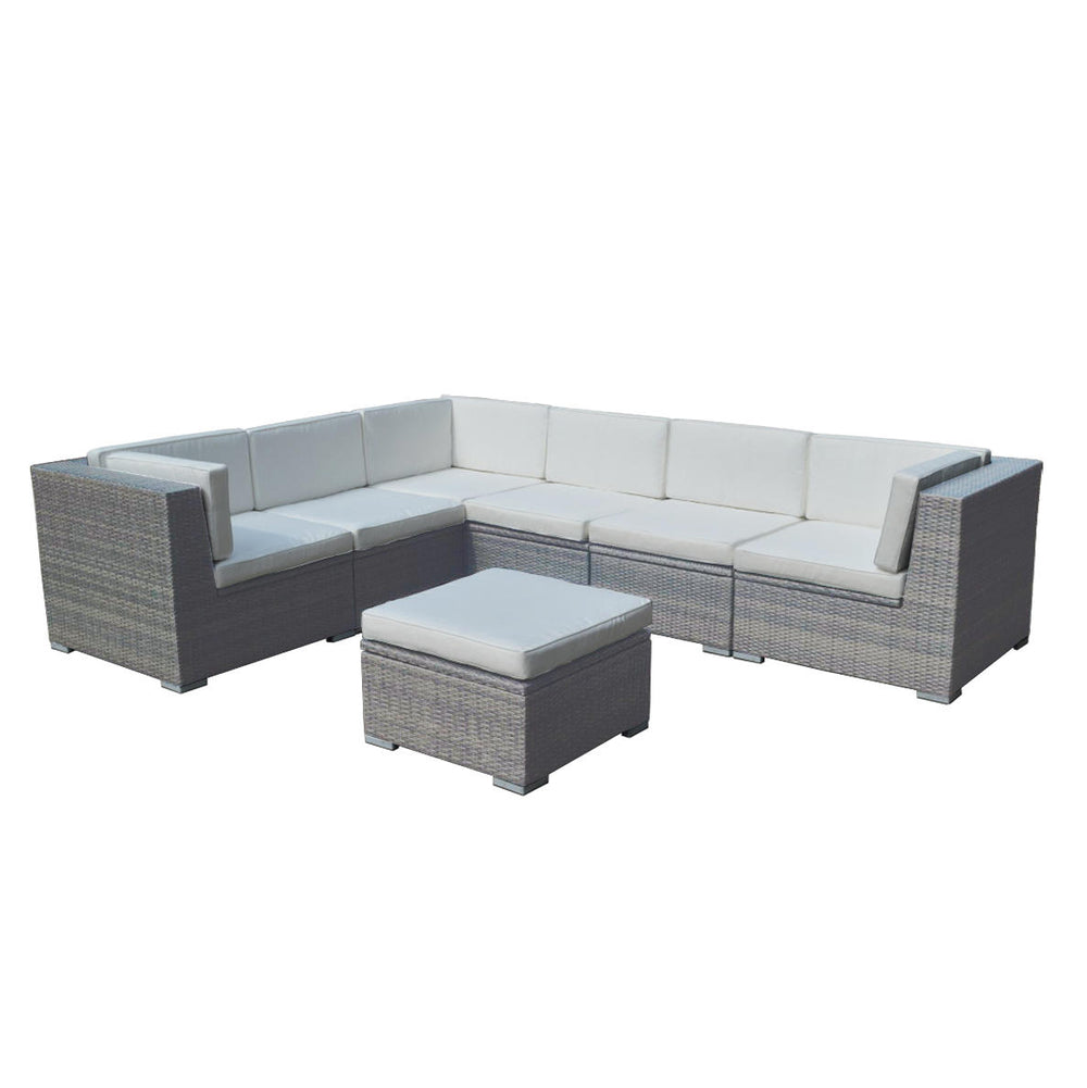 The weave is a grey weave and the deep seating cushions are covered with a natural polyester cover.