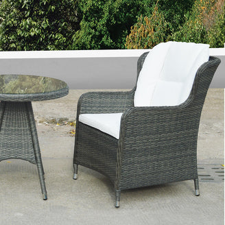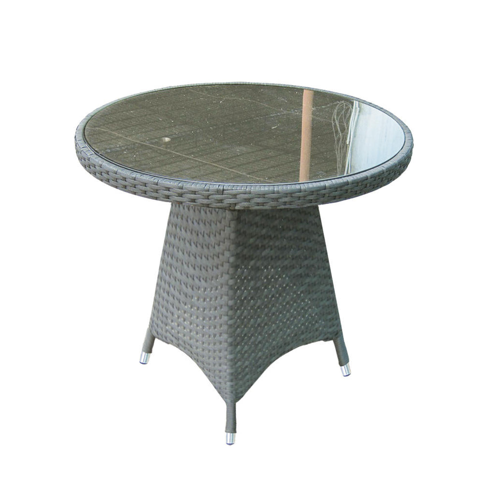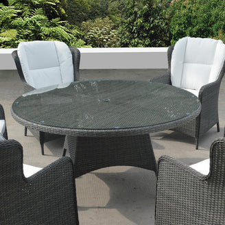 The 150cm table is complete with a toughened glass top and has a parasol hole as standard. The weave is a grey weave.