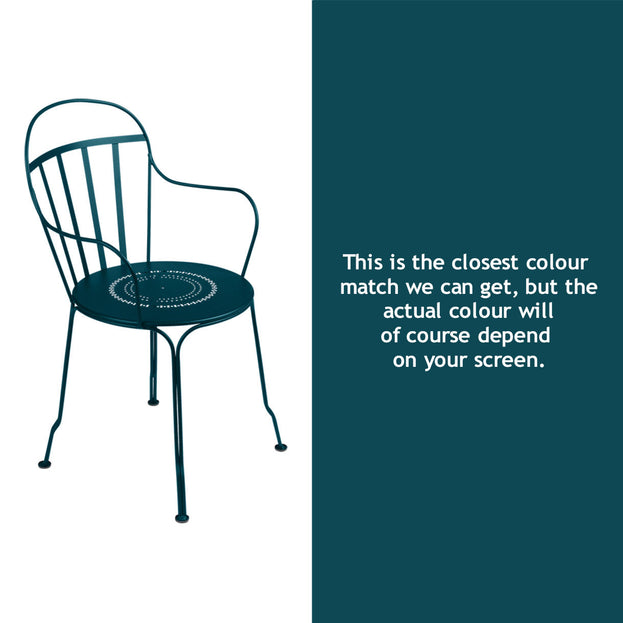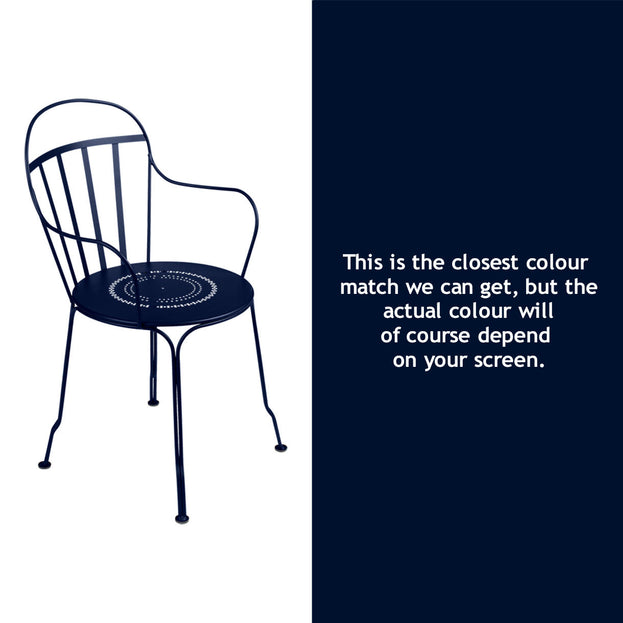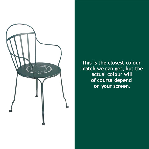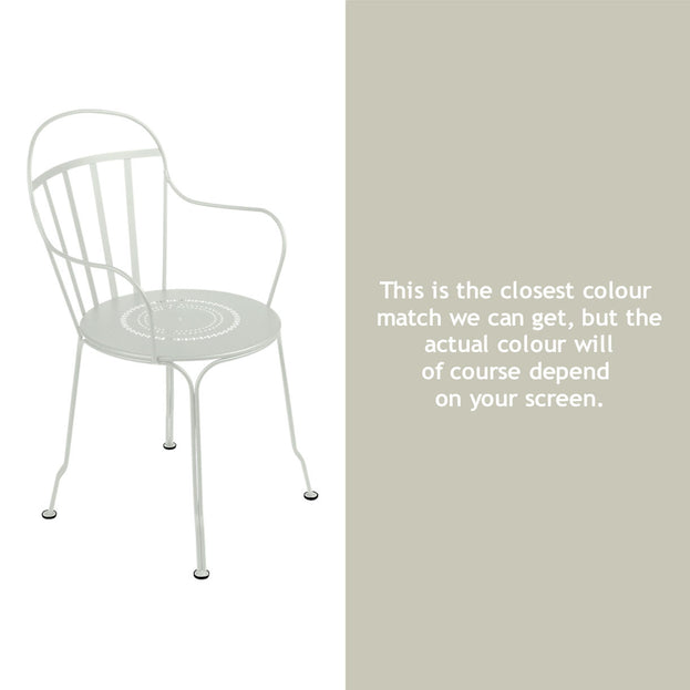 Metal garden armchairs in traditional French style that can be stacked for easy storage.