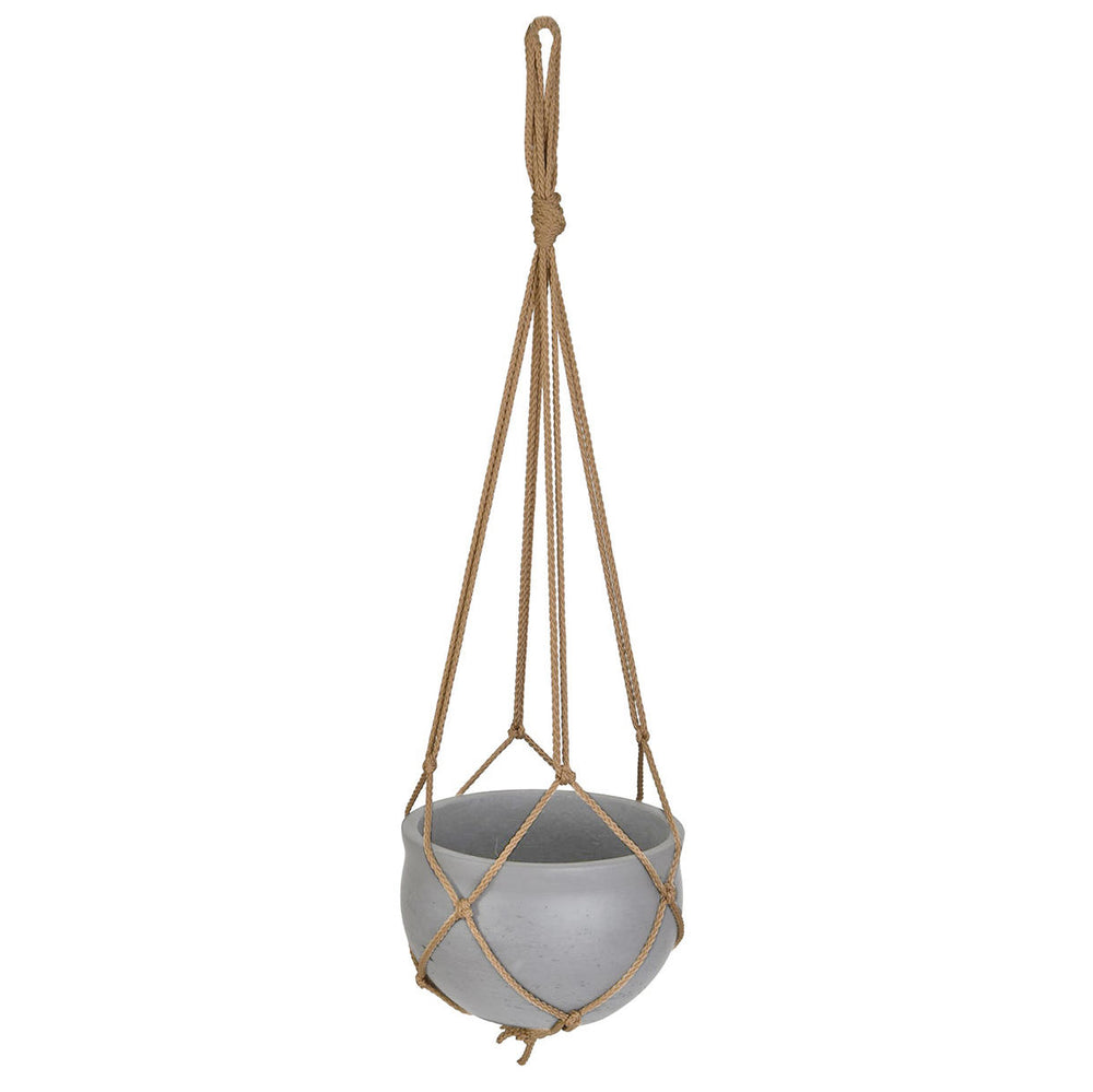 Simple and classic terracotta pot with a rustic cream glaze hangs in rope macrame.