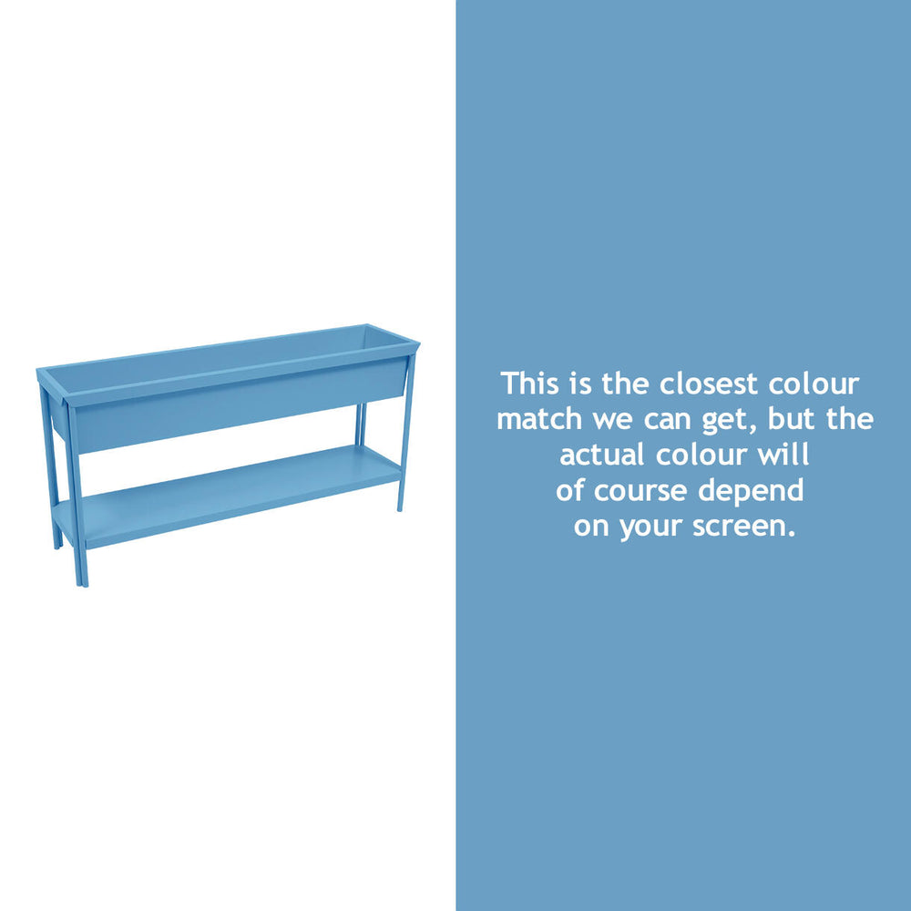 The planter has a tubular steel frame base and sheet steel tray. The tray has a drainage hole with an offset drainage system. The planter box is removable from the stand.