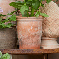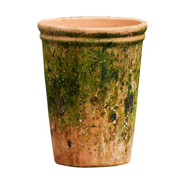 This delightful classic shaped terracotta plant pot with a rustic vintage patina in green moss so the pot looks as though it has been tucked at the back of a Victorian greenhouse for years.