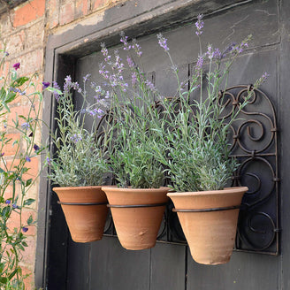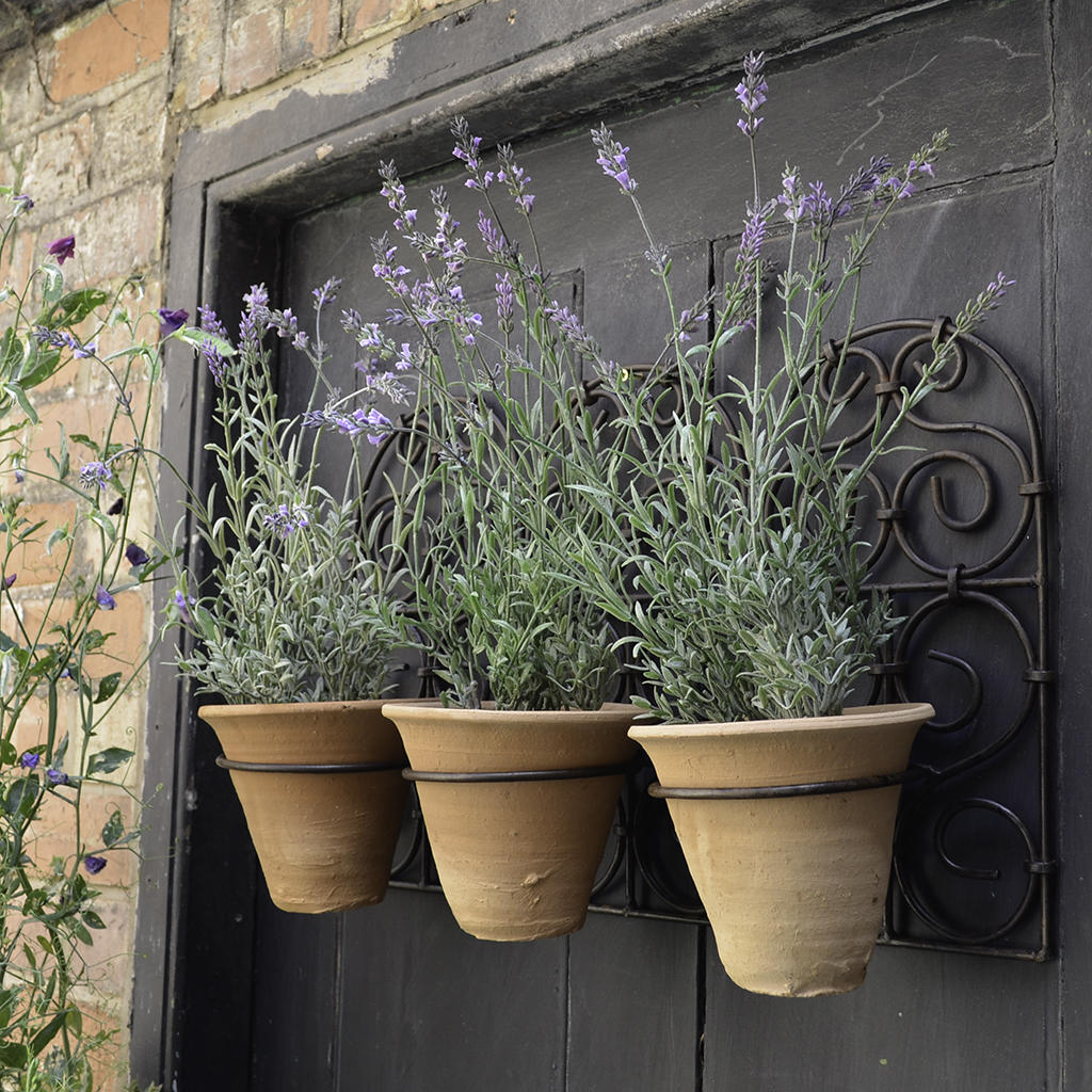 Made from metal the holder can be left outside all year round but the rustic terracotta pots should be brought in during cold winter months.