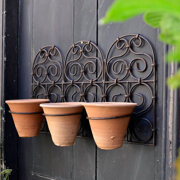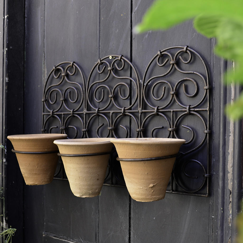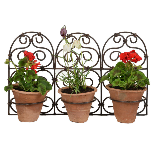 Lovely metal morroccan style pot holder with three terracotta pots, will add colour to small spaces in courtyard gardens or unloved walls.