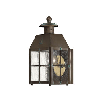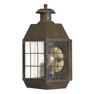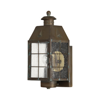 The Nantucket Outdoor Wall Lanterns ooze New England nautical charm, from the finial on the top of the lanterns to the aged verdigris brass detailing.