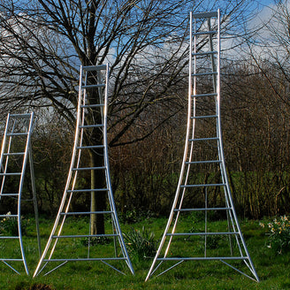 We've tried these excellent ladders and they are so versatile. Depending on the slope, you can either work face-on, with the 3rd leg poked into the hedge, or sideways, with the ladder parallel to the hedge. They allow you to spend all the time necessary to do trimming and pruning jobs properly, without rushing because of the their adaptability, stability and comfort. The wide base, deep steps and telescopic back leg, as well as clawed feet and flat top make them incredibly safe and easy to use. Rather like in the design of the Eiffel tower, your weight is directed downwards and outwards, pinning the ladder to the ground.
