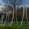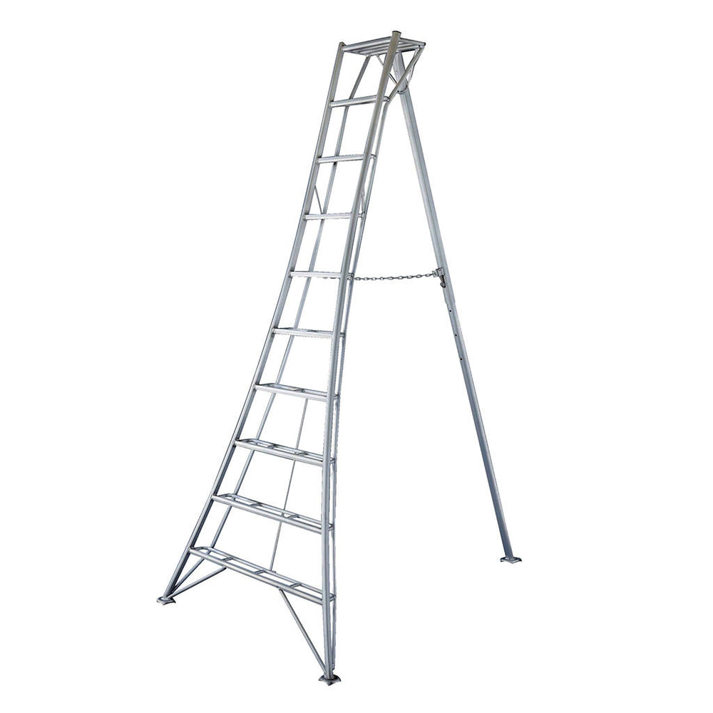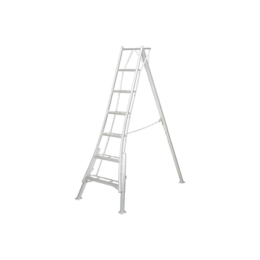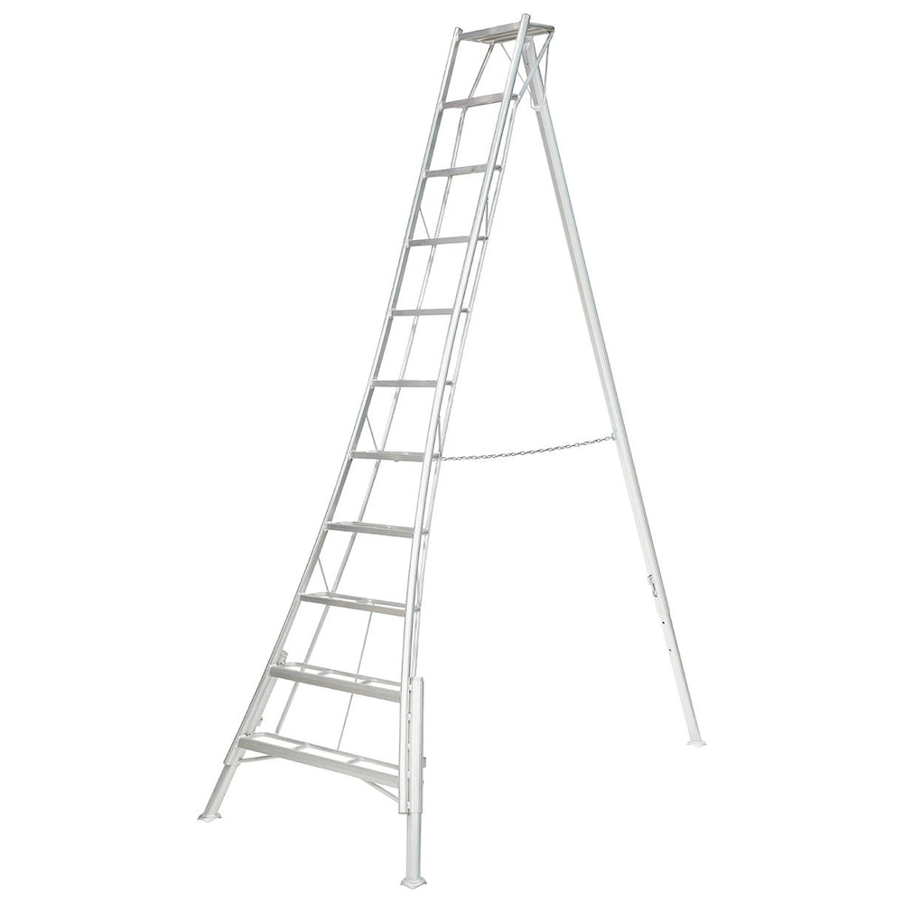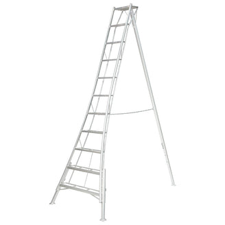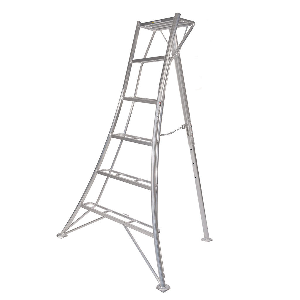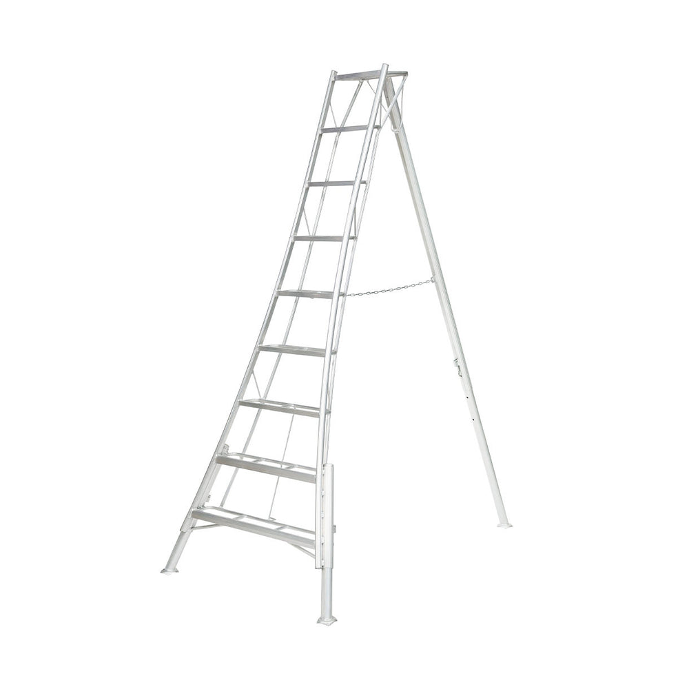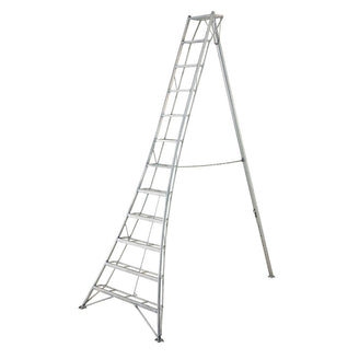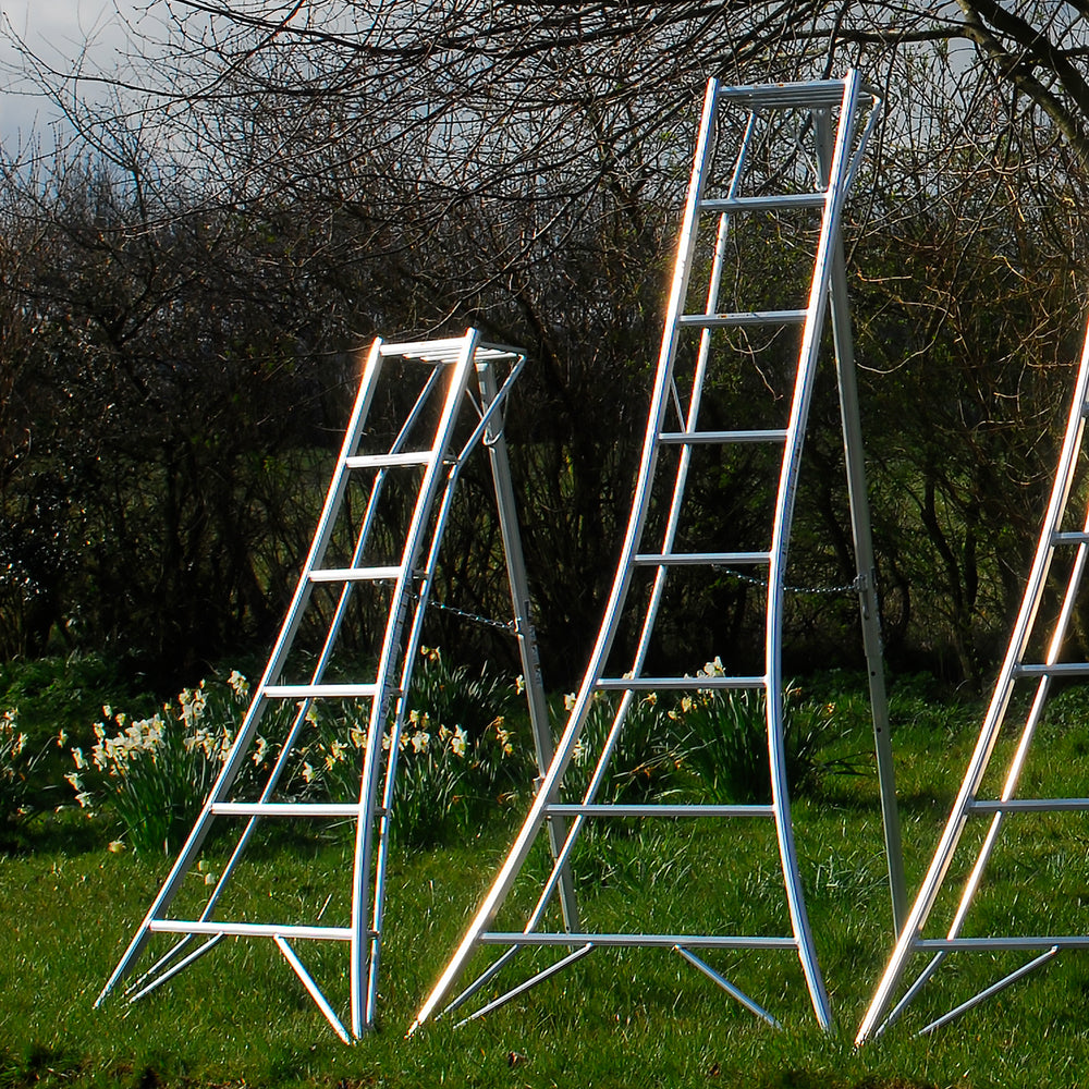 Ideal for orchard work, both for picking and pruning, where thanks to the single back leg, you can can get right into the crown of the tree. Unlike traditional orchard designs (pointed A-Frame), you can lean over the top, or rest picking baskets etc on top. They’re also considerably wider at the base than A-Frames, have the telescopic back leg (vital on slopes) and of course are welded not riveted, so are much, much stronger - and exceptionally light and easy to use. Users include tree surgeons, topiary specialists, head gardeners, orchard owners, hedging contractors and landscapers, as well as keen gardeners whom appreciate the stability and practicality of the tripod design.