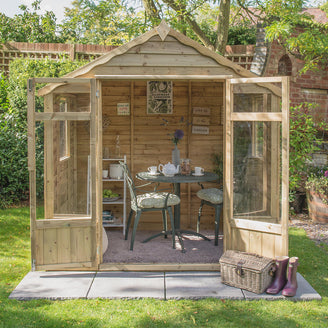 The Oakley Summerhouses features ¾ length windows and glazed double doors so the interior is flooded with light, to make a delightful summerhouse, garden room or summer retreat.