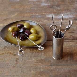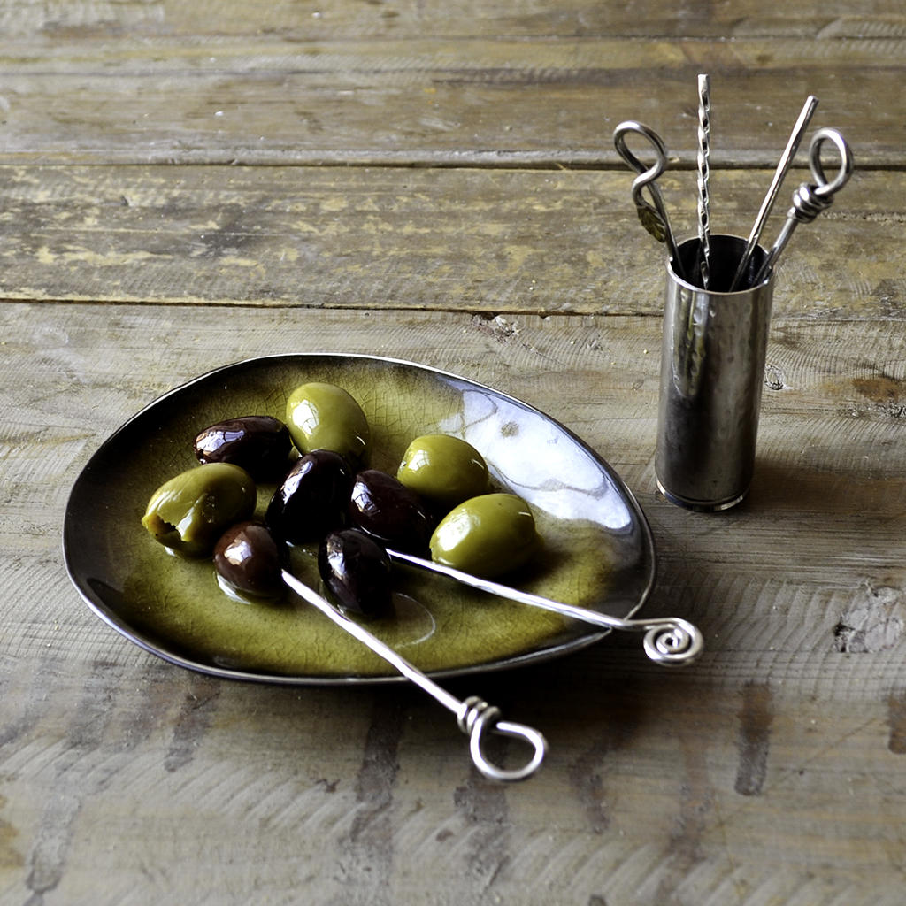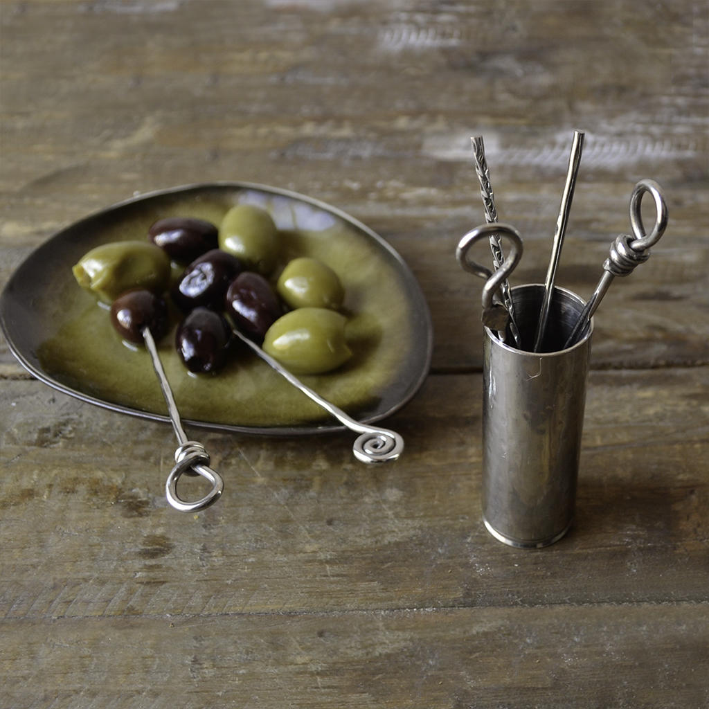 Made in beaten stainless steel the holder contains 6 olive picks with different style of handle.