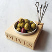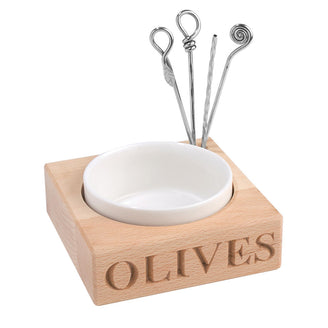 Made from solid chunky beech wood with a white ceramic dish to hold the olives. The beechwood is handily and deeply engraved with the word OLIVES in case of any confusion ;)