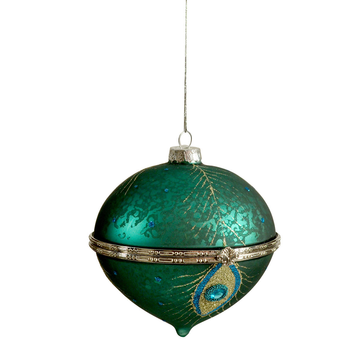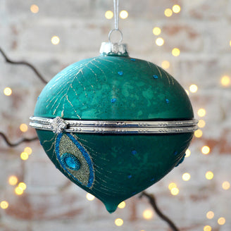 This lovely onion shaped glass bauble is exquisitely decorated in delightful peacock blues and silver detailing.