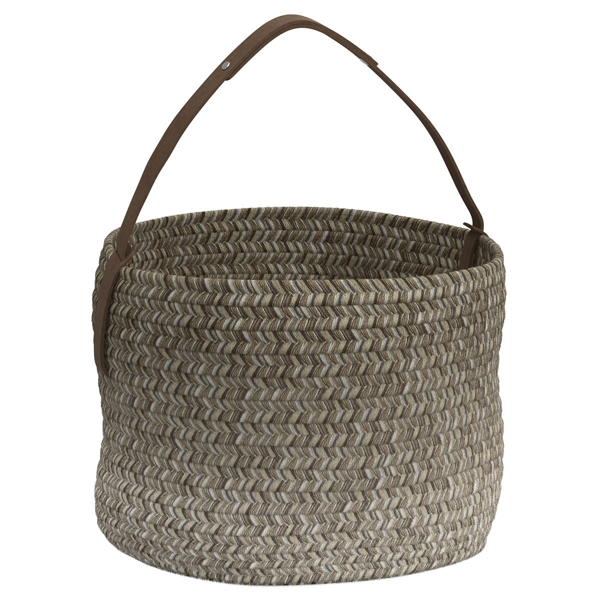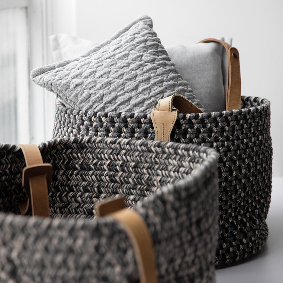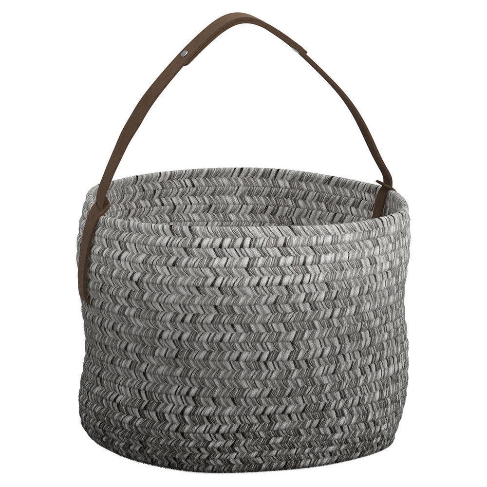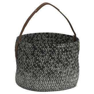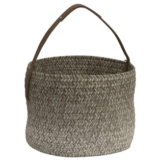 Made from woven Sunbrella acrylic outdoor rope basket with a natural leather handle.
