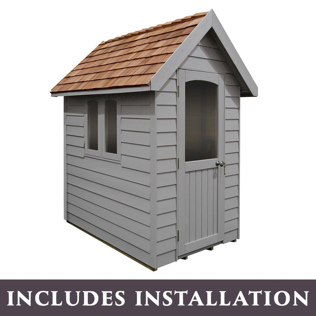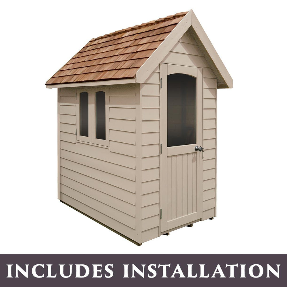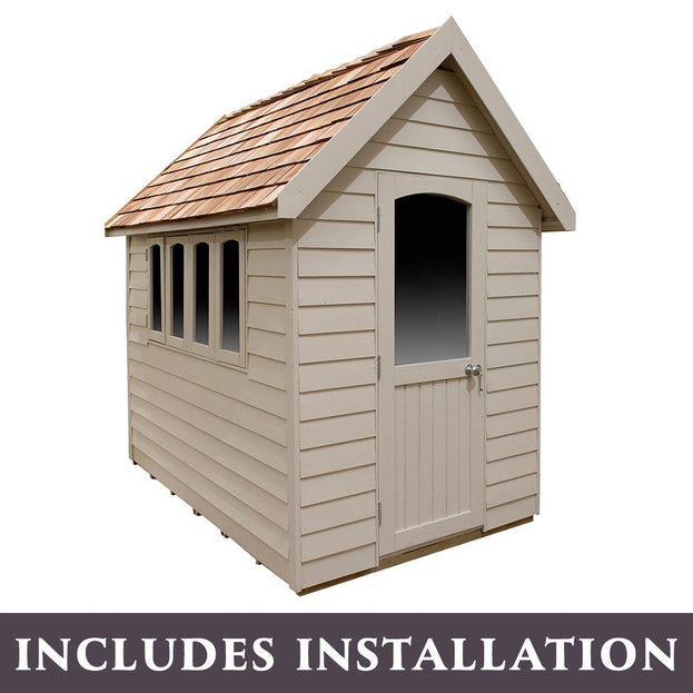 Retreat sheds are hand made to order using smooth planed Redwood Lap board and a delightful Red Cedar shingle roof.