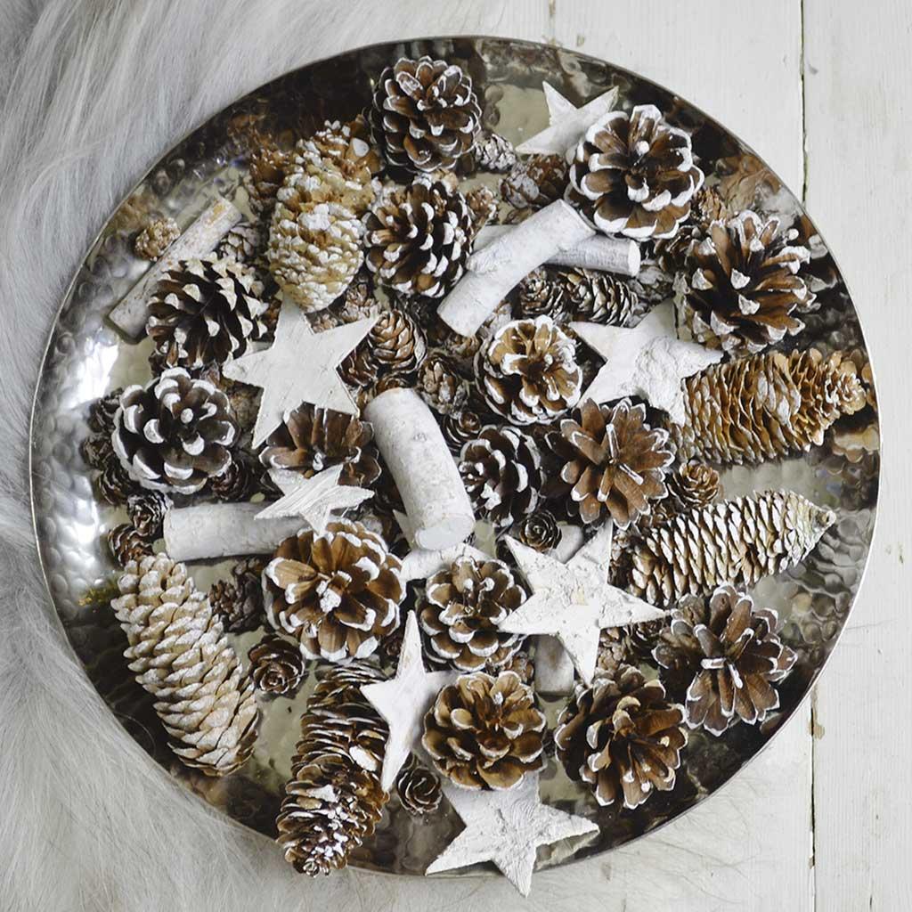Lovely natural pines cones and wooden stars to decorate your Christmas table, all lightly dusted with white frosting.